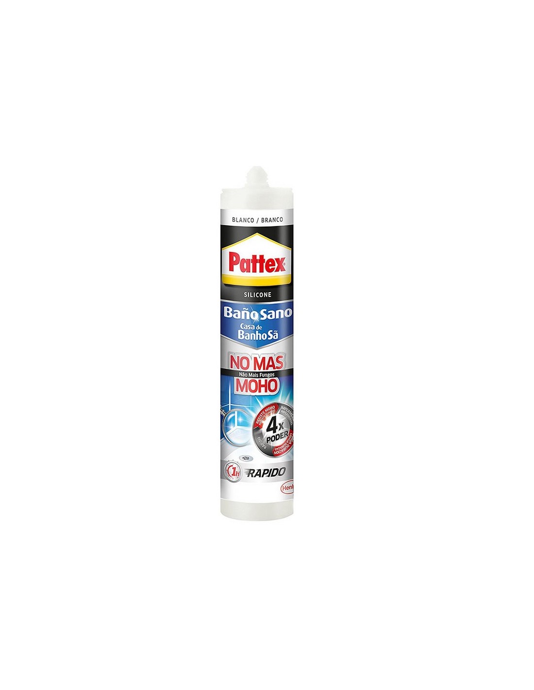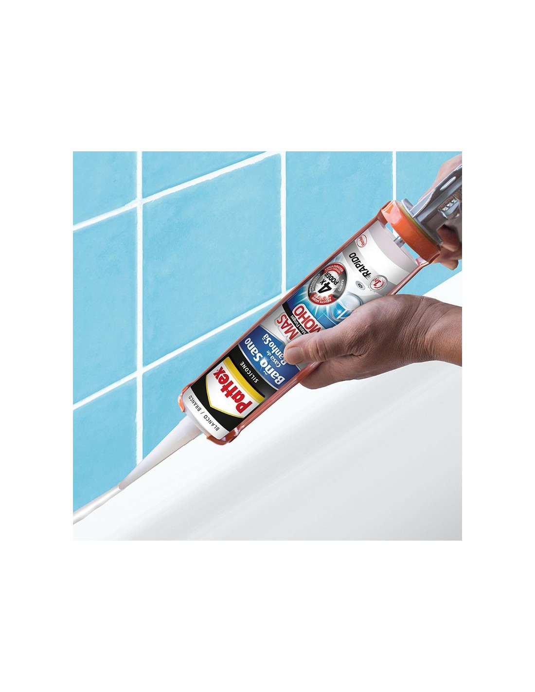 Silicona antimoho PATTEX No más moho. 4 efectos: resistente al moho, impermeable, larga duración y rápida. Sellador de silicona sanitaria antimoho para acabados y sellados de juntas de baño. Buena adherencia sobre cerámica vitrificada, porcelana, vidrio, madera, fibra de vidrio, aluminio, anodizado, acero inox. No adhiere sobre PE, PP, PTFE. Blanca. Cartucho 280 ml.