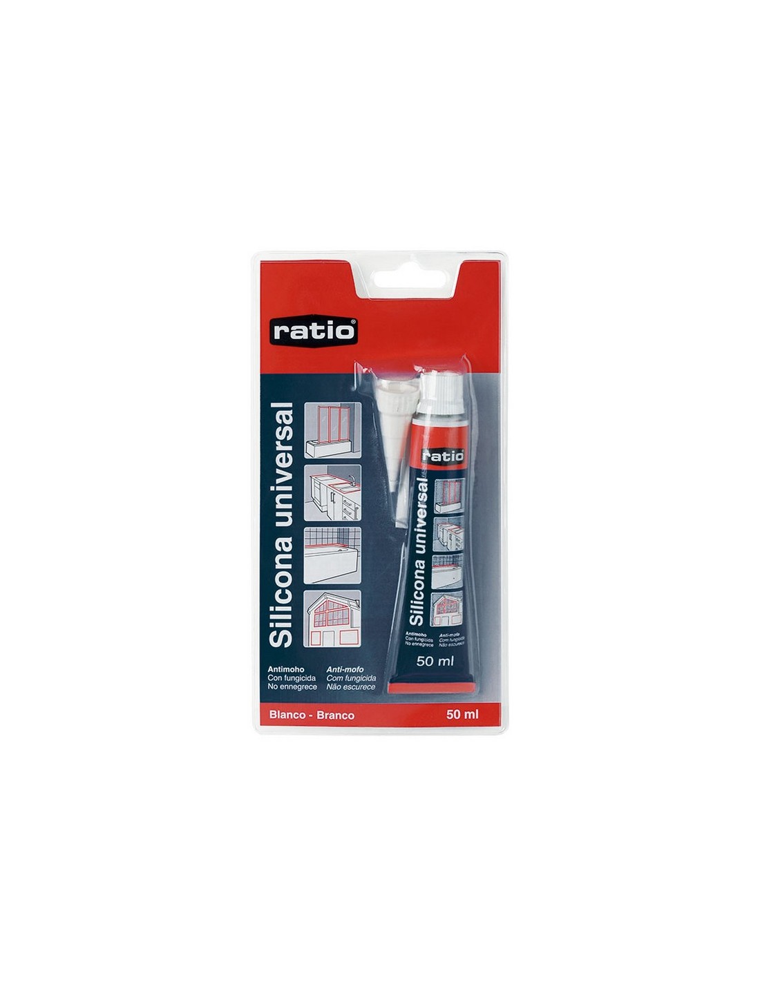 Silicona universal RATIO multiuso Ideal para aplicar en juntas de baños, aseos y cocinas. Gran poder fungicida, evitando el ennegrecimiento durante más tiempo. Excelente adhesión sobre cerámica, superficies vitrificadas y otros materiales no porosos. Transparente. Tubo 50 ml.