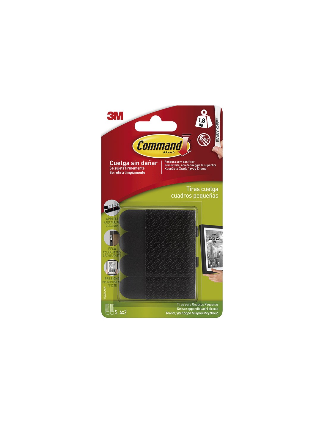 Tiras cuelgacuadros 3M serie Command Cintas resistentes al agua. Sin necesidad de hacer agujeros. Se adhieren a multitud de superficies; paredes pintadas, madera, baldosas.Se retiran limpiamente, sin marcas, sin residuos pegajosos, ni manchas. Reutiliza los ganchos usando las tiras de r Pequeñas. 8 unid. (4 juegos). Marcos 20-25 cm. Soporta 0,5 kg cada juego. Negra.