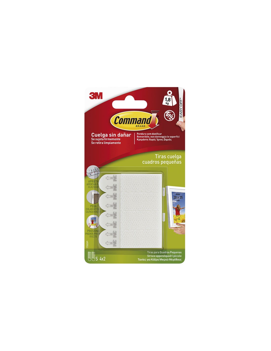 Tiras cuelgacuadros 3M serie Command Cintas resistentes al agua. Sin necesidad de hacer agujeros. Se adhieren a multitud de superficies; paredes pintadas, madera, baldosas.Se retiran limpiamente, sin marcas, sin residuos pegajosos, ni manchas. Reutiliza los ganchos usando las tiras de r Pequeñas. 8 unid. (4 juegos).Marcos 20-25 mm. Soporta 0.5 kg cada juego. Blanca.