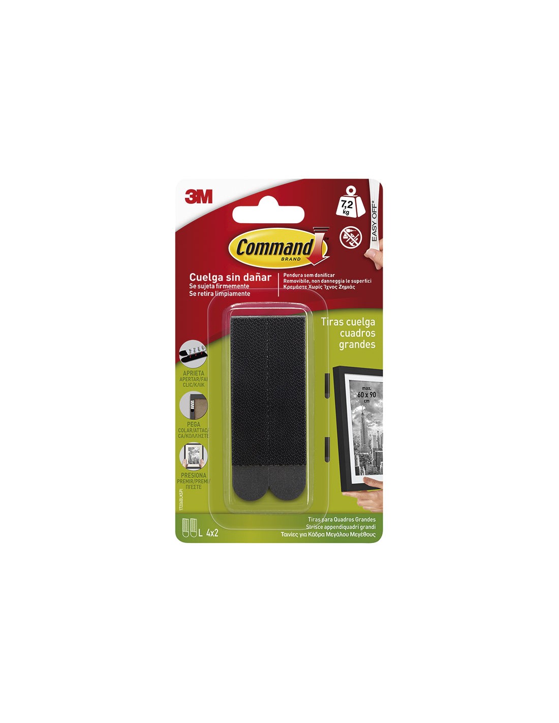 Tiras cuelgacuadros 3M serie Command Cintas resistentes al agua. Sin necesidad de hacer agujeros. Se adhieren a multitud de superficies; paredes pintadas, madera, baldosas.Se retiran limpiamente, sin marcas, sin residuos pegajosos, ni manchas. Reutiliza los ganchos usando las tiras de r Grandes. 8 unid. ( 4 juegos). Marcos 60-90 cm. Soporta 1.8 kg cada juego. Negra.