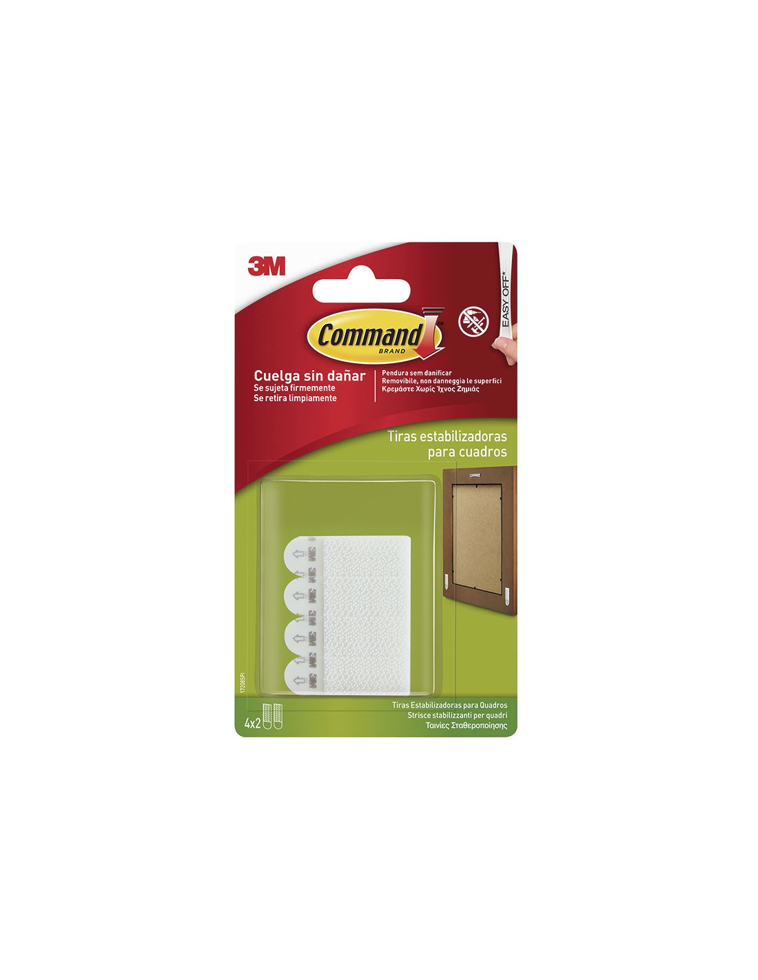Tiras cuelgacuadros 3M serie Command. Cintas resistentes al agua. Sin necesidad de hacer agujeros. Se adhieren a multitud de superficies; paredes pintadas, madera, baldosas.Se retiran limpiamente, sin marcas, sin residuos pegajosos, ni manchas. Reutiliza los ganchos usando las tiras de r Micro. 8 unid. (4 juegos). Estabilizador. Blanca.