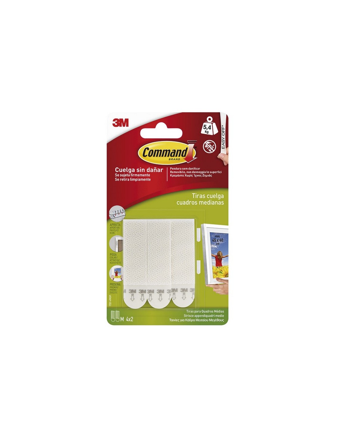 Tiras cuelgacuadros 3M serie Command Cintas resistentes al agua. Sin necesidad de hacer agujeros. Se adhieren a multitud de superficies; paredes pintadas, madera, baldosas.Se retiran limpiamente, sin marcas, sin residuos pegajosos, ni manchas. Reutiliza los ganchos usando las tiras de r Medianas. 8 unid. ( 4 juegos). Marcos 45-60 cm. Soporta 1.4 kg cada juego. Blanca.