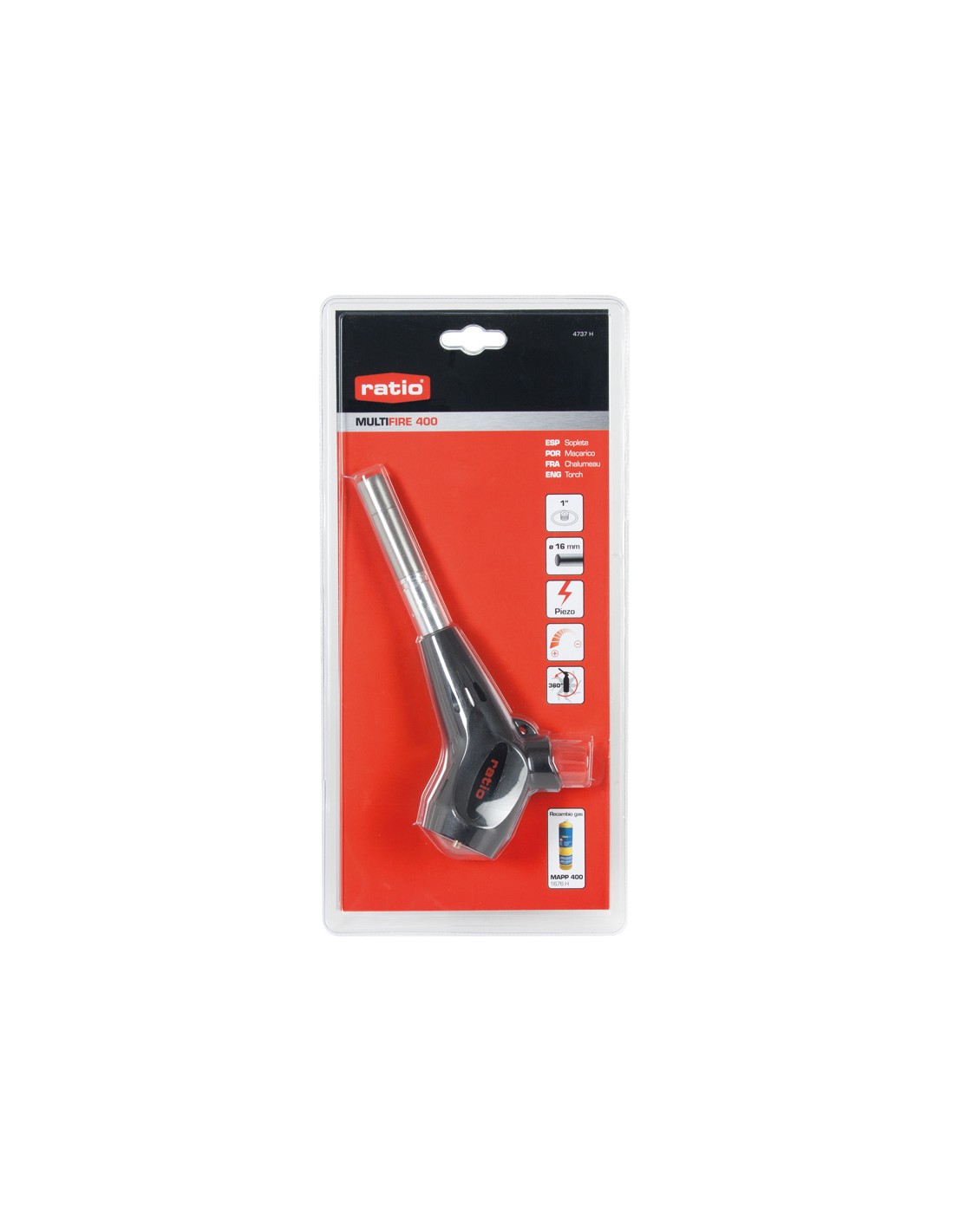 Soplete RATIO MultiFire 400. Soldadura fuerte de cobre hasta ø 35 mm. con alto contenido de plata. Recomendado para todo tipo de soldadura blanda. Boquilla envolvente, se puede usar en cualquier posición. Regulador de llama muy preciso. Encendido piezoeléctrico. Conexión a cartucho MAPP gas 1". (US). Soplete quemador inox ø 16 mm.