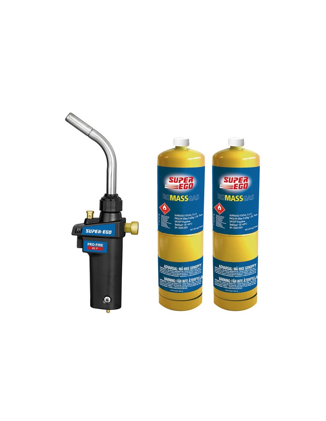 Soldador Super Ego Pro-Fire con 2 cartuchos Soplete profesional para trabajos de soldadura fuerte. Funciona en posición invertida. Encendido piezoeléctico. Incluye 2 cartuchos Romassgas.