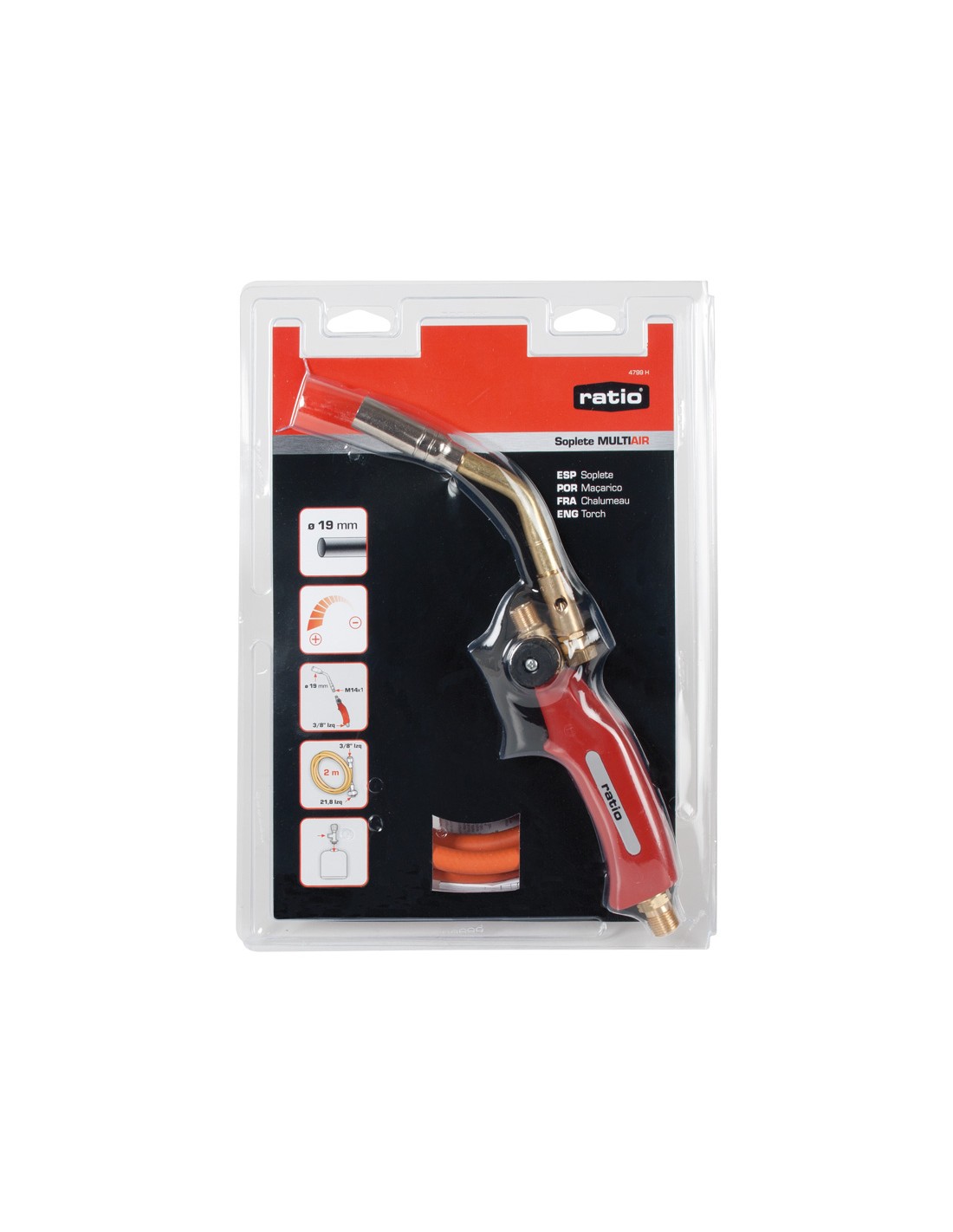 Soplete RATIO MultiAir. Aplicaciones profesionales de fontanería, aircon o decapado. Llama envolvente. Mango ergonómico con regulador. Conexión directa R3/81"L bombona gas butano/propano. Soplete ø quemador 19 mm.