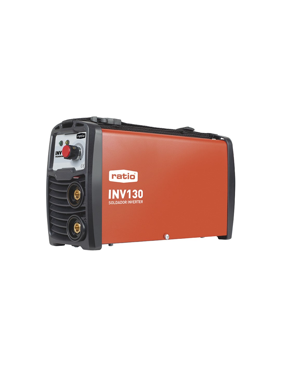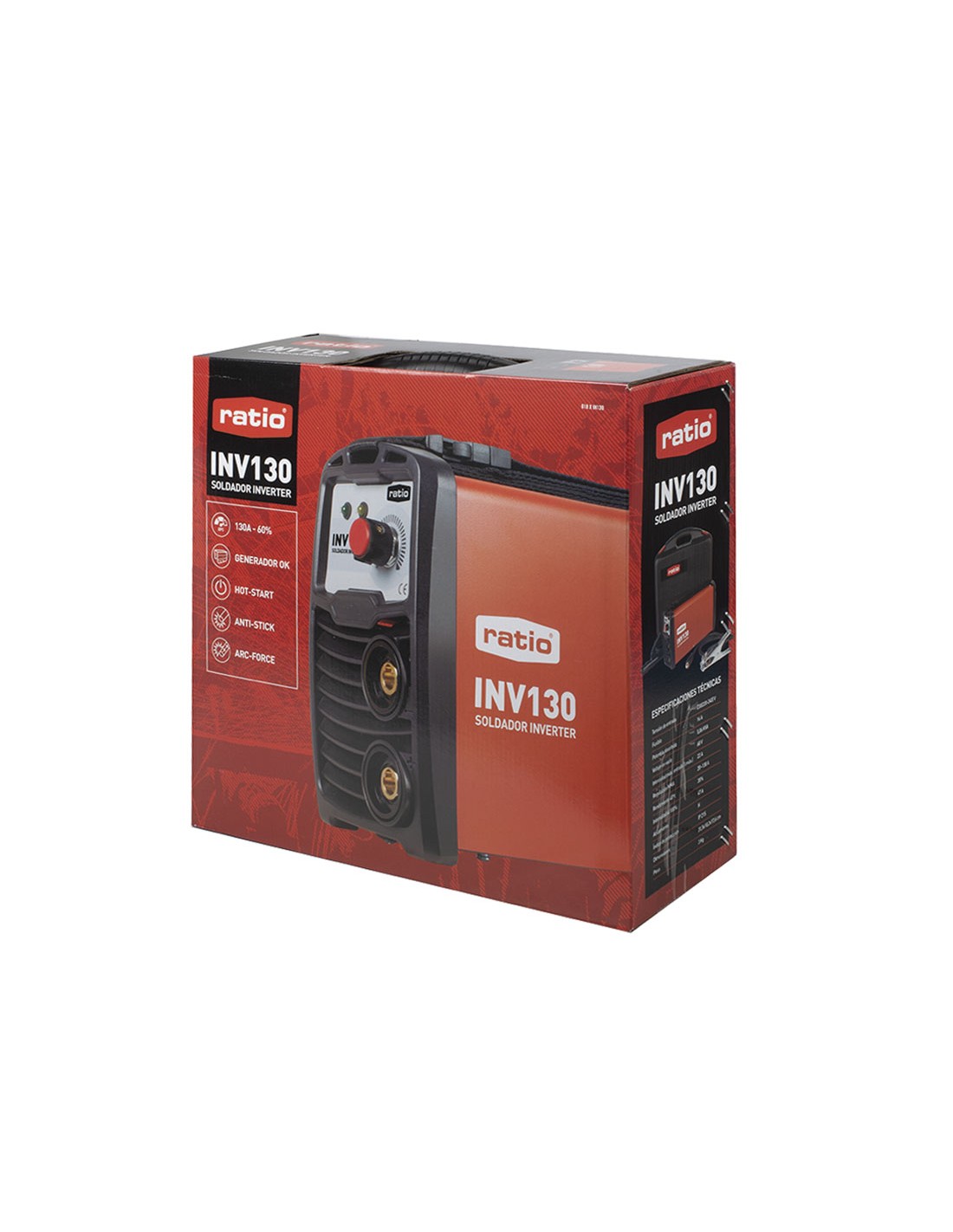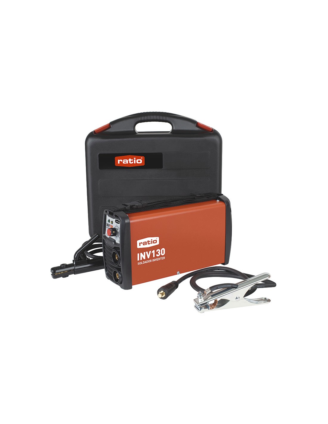 Soldador inverter RATIO INV-130 Monofásico 230 V - 1ph. Electrodos: rutilo, básico, acero inox, hierro fundido, aluminio. Incluye pinzas porta-electrodo y masa, cables de soldadura, conectores, cinta de transporte y maletín. Protección IP21S. Potencia 130 A.