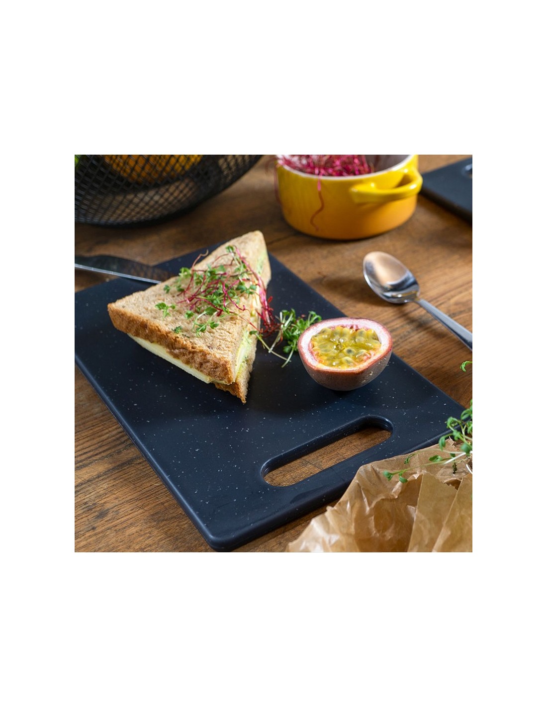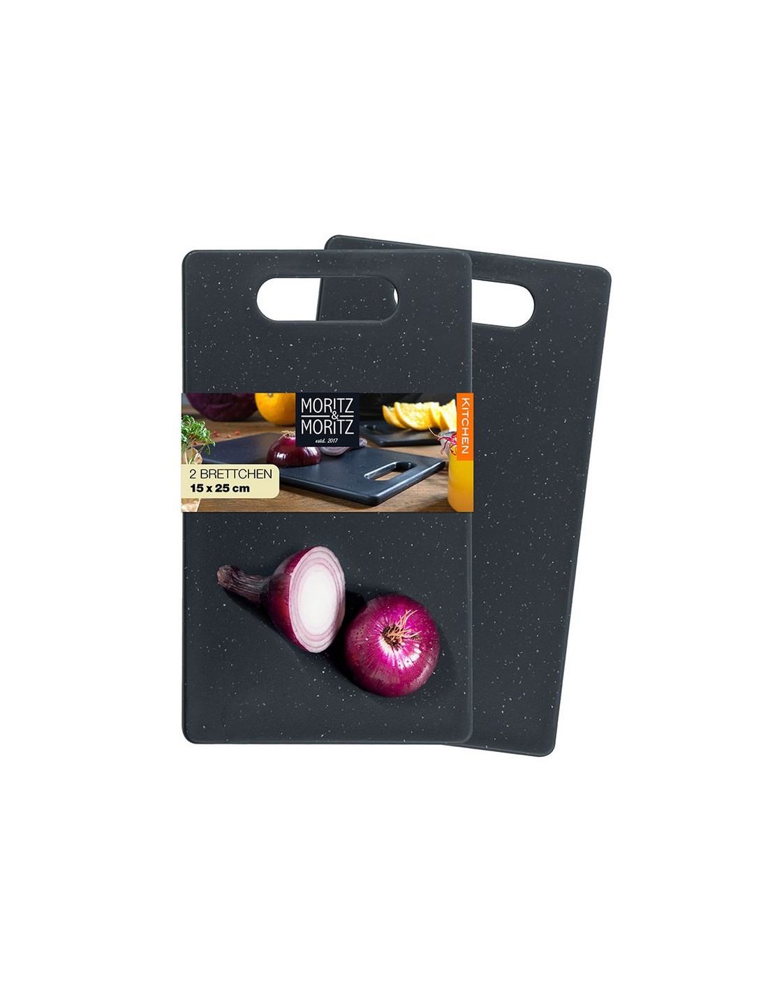 Tabla cortar MORITZ Juego 2 unidades. Plástico de alta calidad, resistente y sin BPA, con aspecto de granito. Apta para lavavajillas. Tacos antideslizantes para mayor seguridad de corte y asa de agarre. 25x15 cm.
