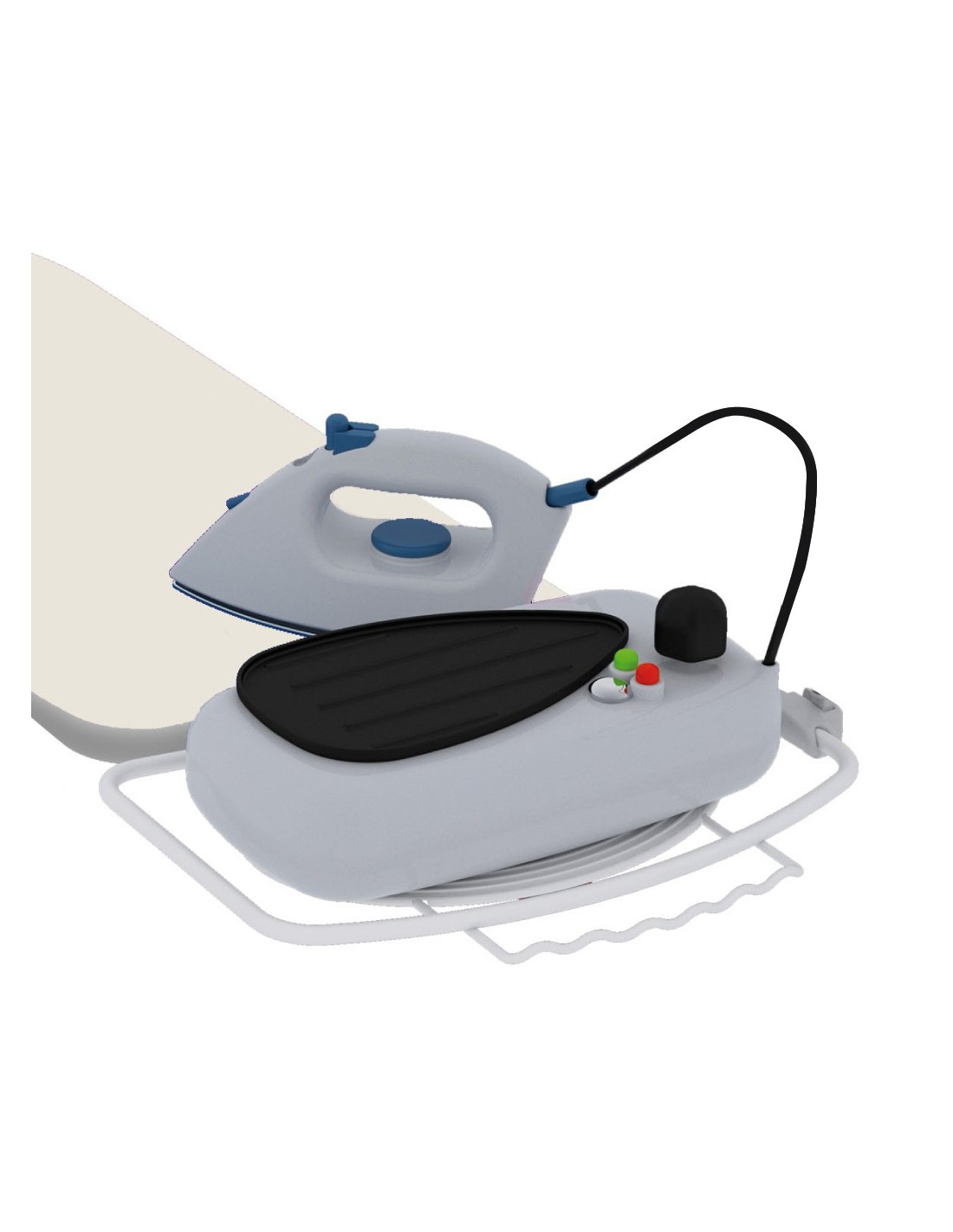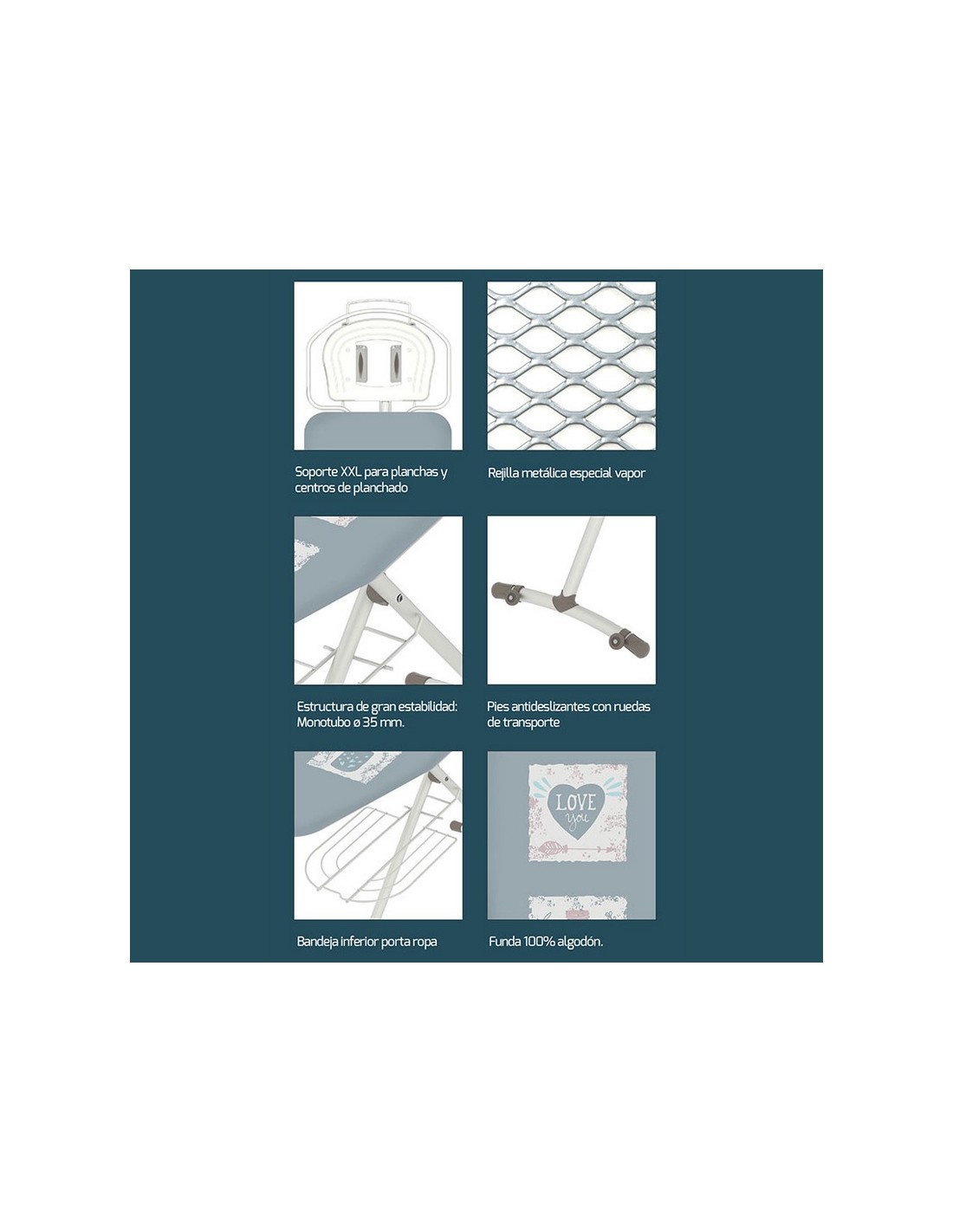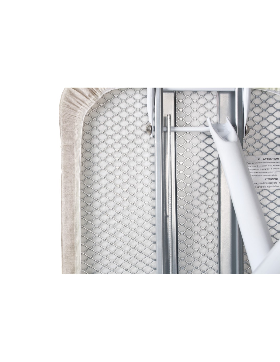 Tabla planchar HABITEX Giove Rejilla metálica. Patas monotubo ø 35 mm. Regulación automática de altura. Reposaplanchas XXL especial centros planchado con inserciones en silicona. Bandeja inferior portarropa. Funda 100% algodón estampado. Pies antideslizantes y ruedas de transporte. Mesa 130x44 cm.