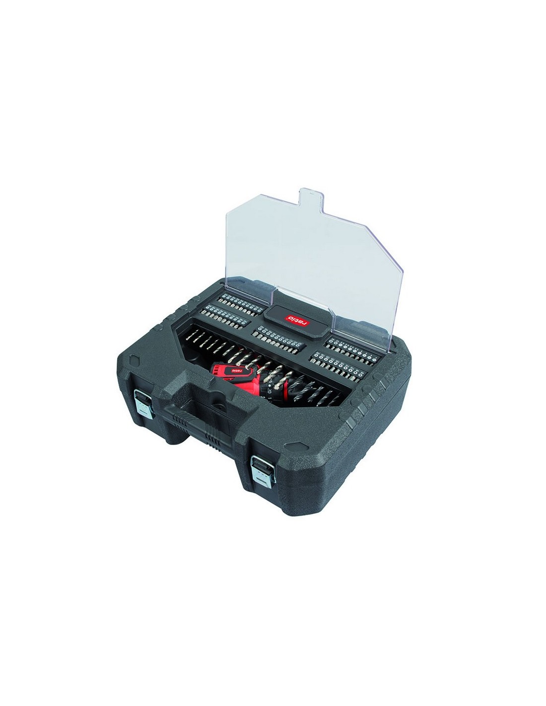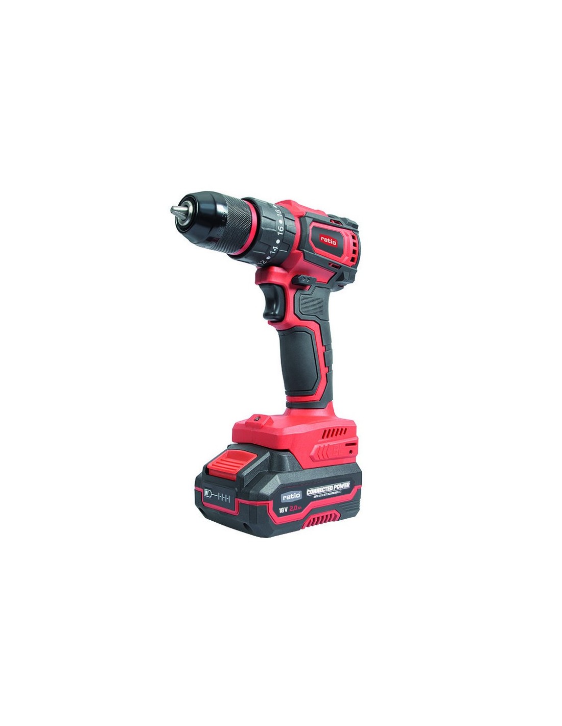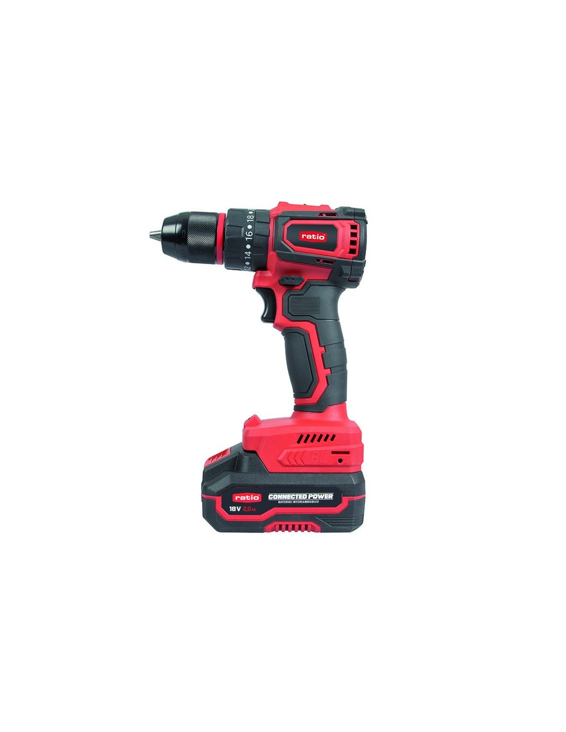 Taladro percutor batería RATIO R-AT40A Sistema de baterías intercambiables Connected Power. Potente motor BRUSHLESS (sin escobillas). Embrague con 21 ajustes. Portabrocas metálico y de cierre rápido. 2 velocidades para mejor par. Indicador luminoso con LED en área de trabajo. Maletín de transporte. Incluye 1 batería 2.0 Ah y 68 accesorios. Potencia: 18 V.