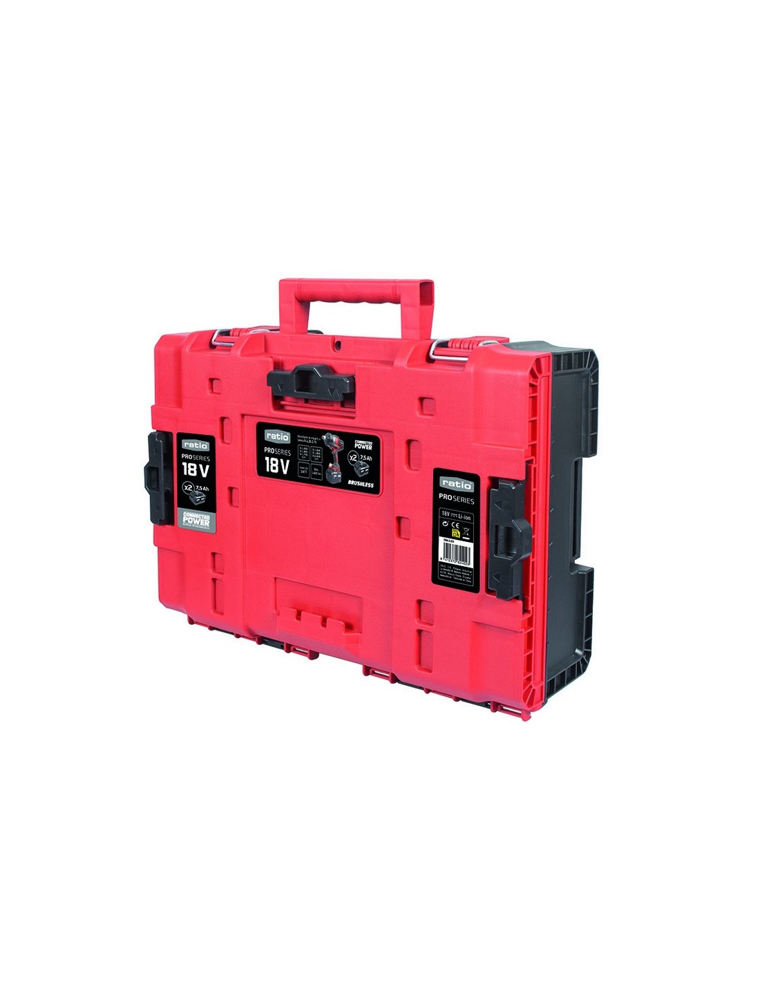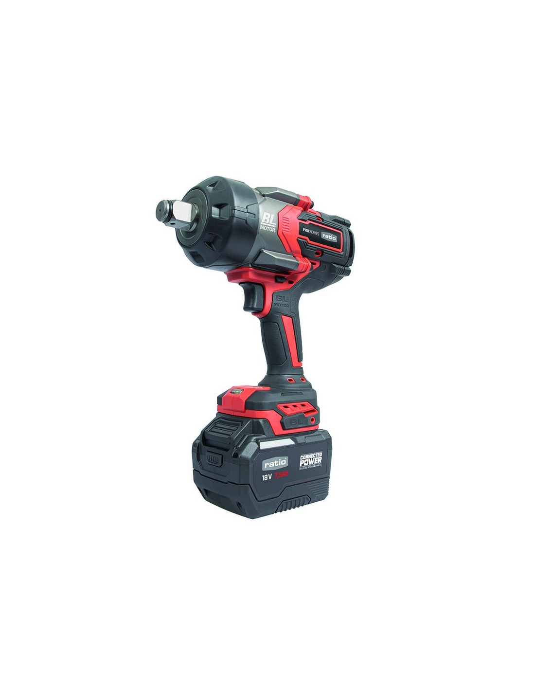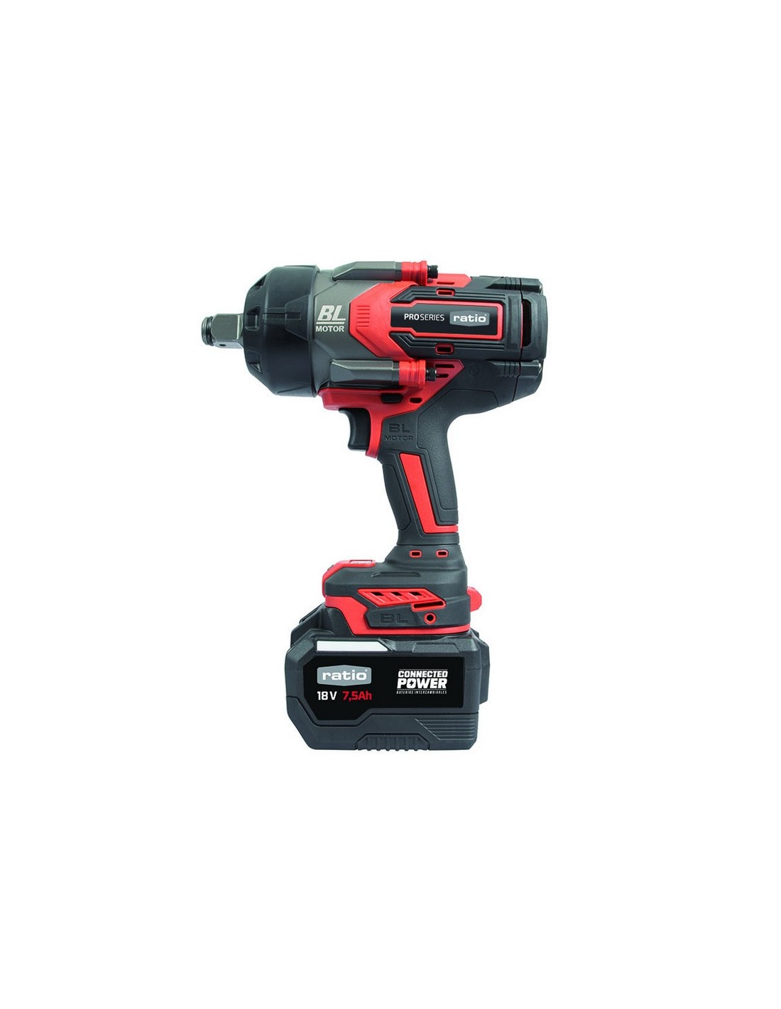 RATIOPROSERIESLlave impacto batería RATIO ProSeries R-LL20-2.75 Sistema de baterías intercambiables Connected Power. Potente motor BRUSHLESS (sin escobillas). Revestimiento de goma anti-vibración. Freno electrónico y embrague de seguridad. Luz LED en área de trabajo. Maletín de transporte con 2 baterías de 7.5 Ah y cargador. Potencia: 18 V.