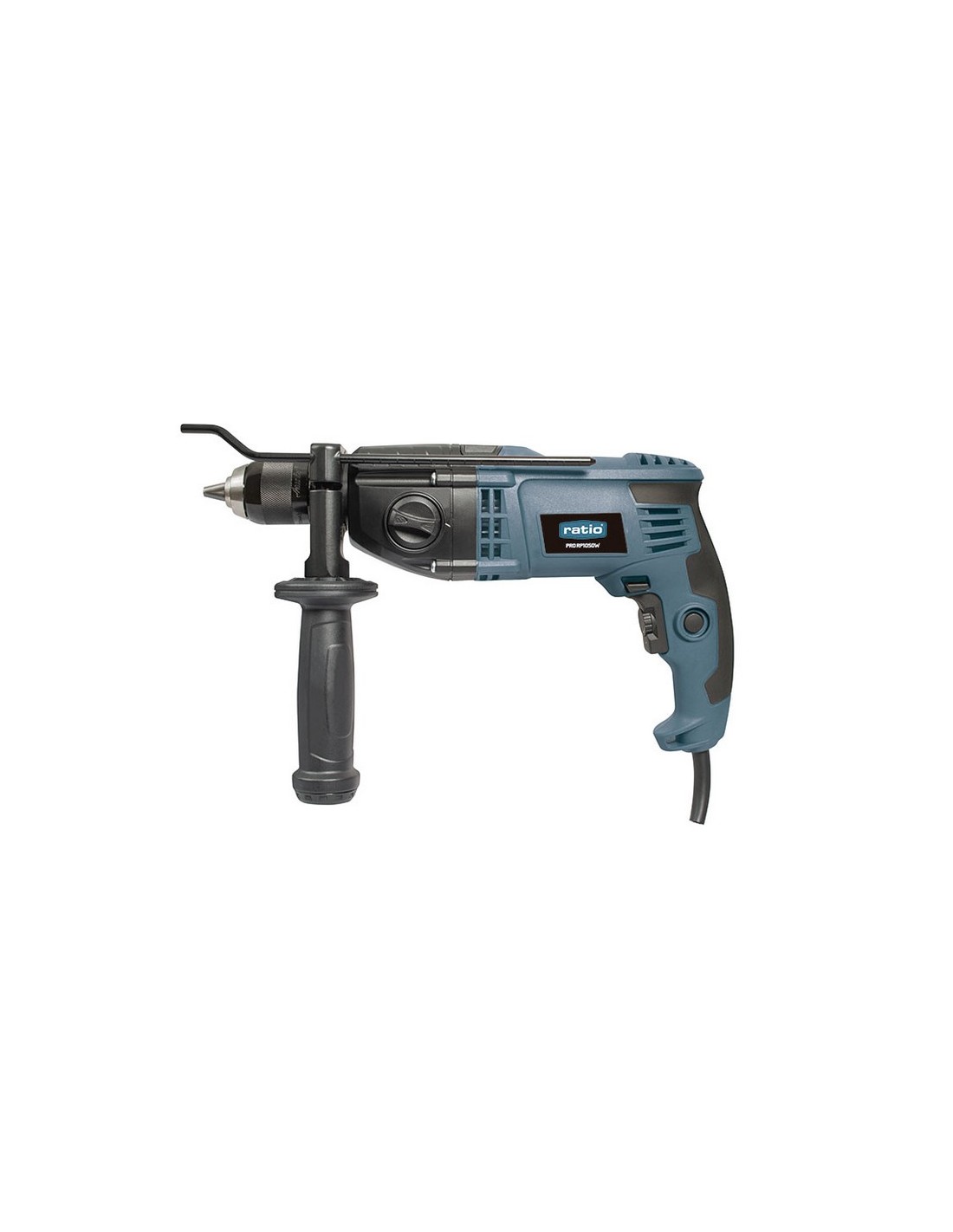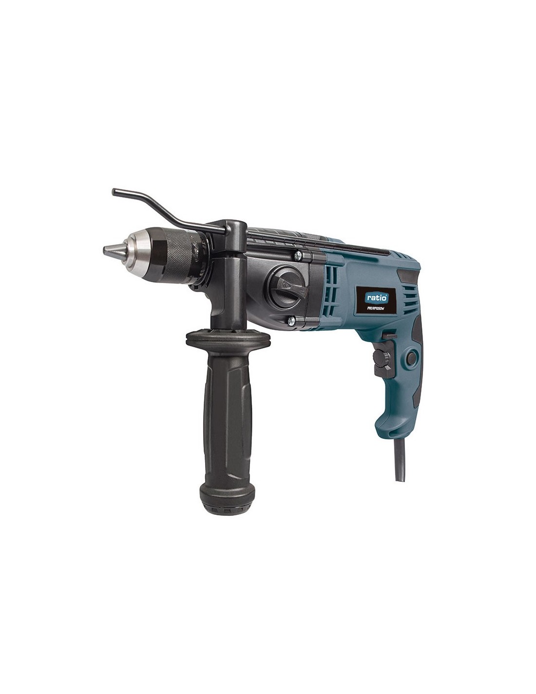 Taladro eléctrico RATIO PRO RP1050W Regulador electrónico de velocidad. Dirección de taladro reversible. 2 velocidades. Portabrocas metálico automático ø 1,5-13 mm. Caja de engranajes de aluminio. Empuñadura bimaterial, empuñadura auxiliar y tope de profundidad metálico. Maletín de transporte. Potencia: 1.050 W.