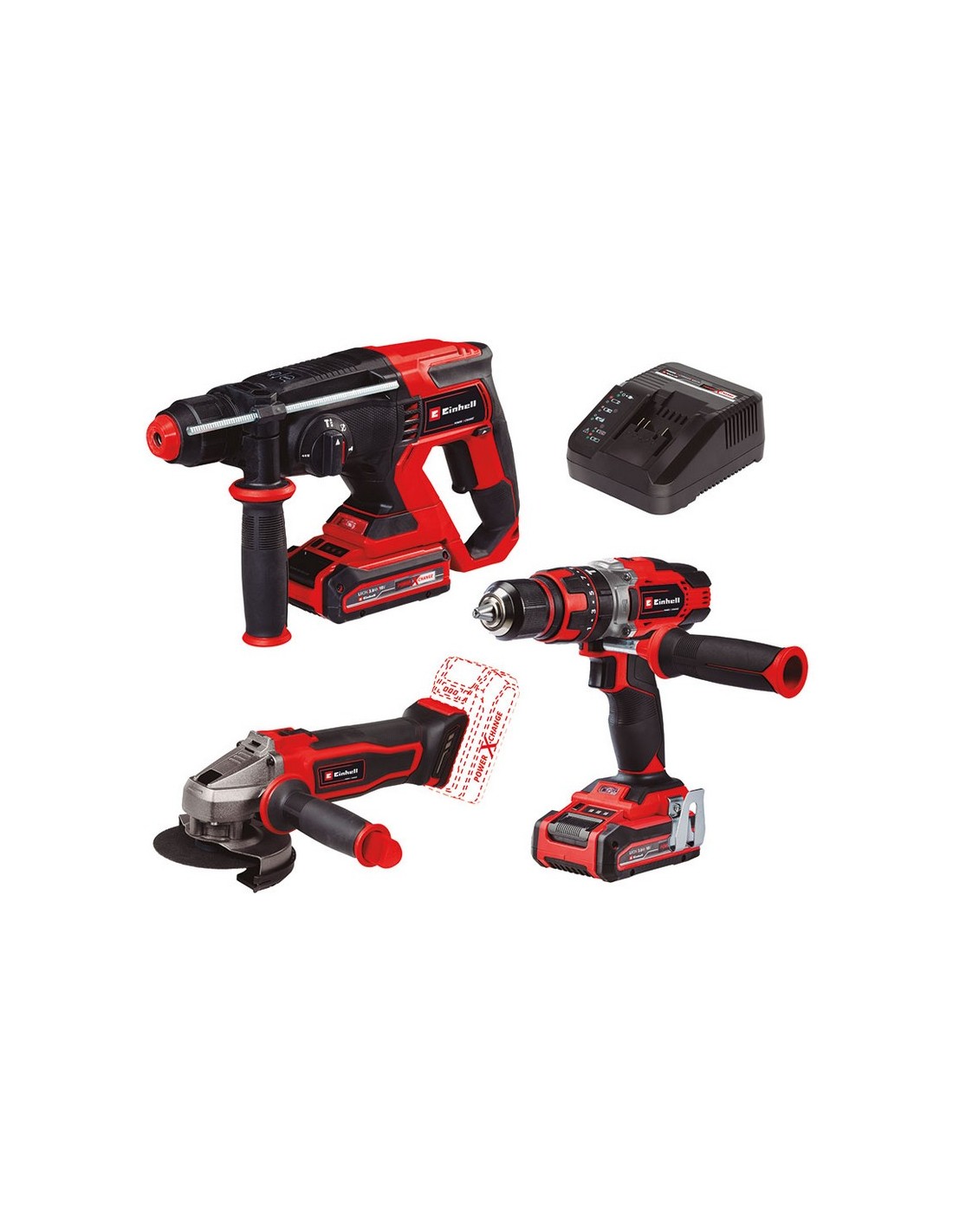Pack martillo/amoladora/atornillador Einhell TE-TK Li+2 Martillo de percusión a batería TE-CD 18/48 Li-i. Amoladora angular a batería TE-AG 18/115-2 Li y taladro percutor a batería TE-HD 18/20 Li. Todas power X-Change y se puede itulizar de forma flexible con cualquier batería o cargador Power X-Change de 18 V. Incluye 2 baterías Power X-Change Plus de 3,0 Ah y un cargador.