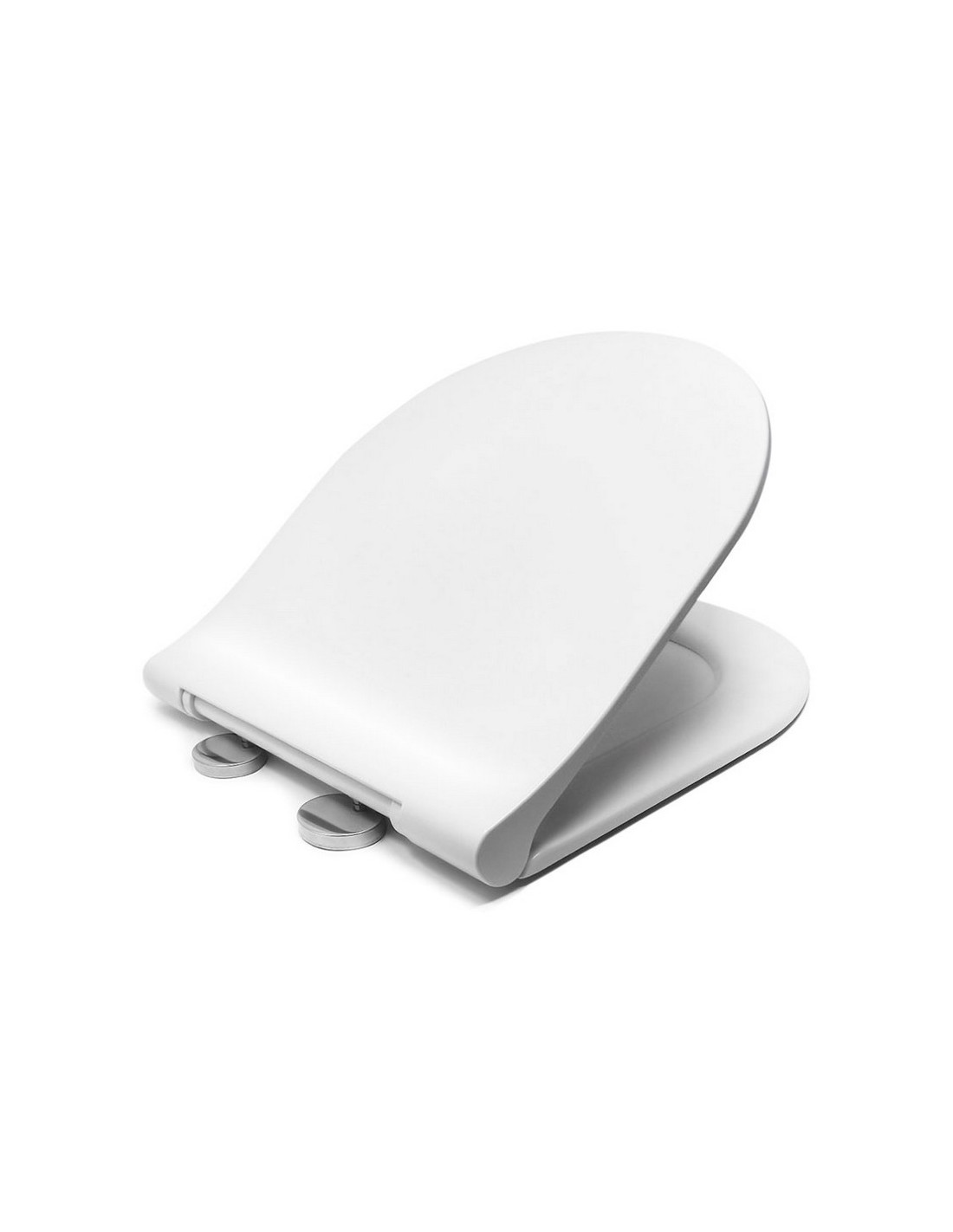 Tapa WC ESTOLI Katerina 2 blanca Caída amortiguada. Bisagra metálica. Montaje superior. Ajustable y extraíble. Medidas: 45,9x19,0 cm.