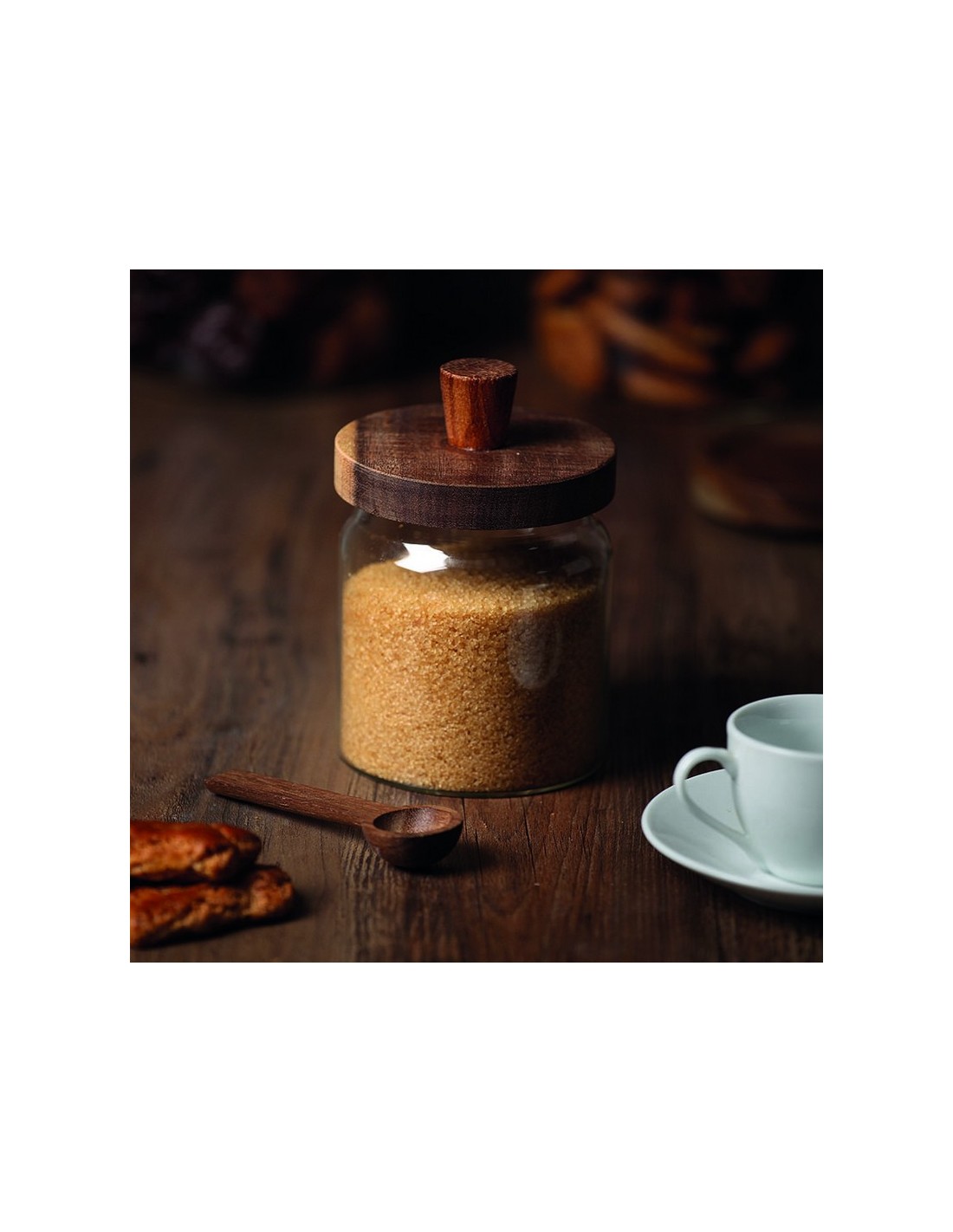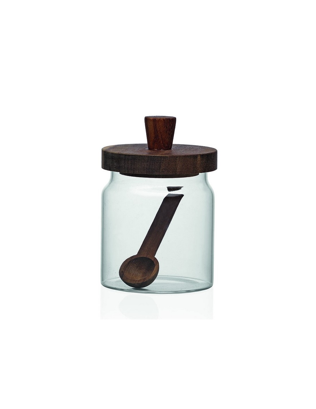 Bote cristal con cuchara Bote en cristal borosilicato y tapa y cuchara en madera de acacia. Capacidad 470ml.