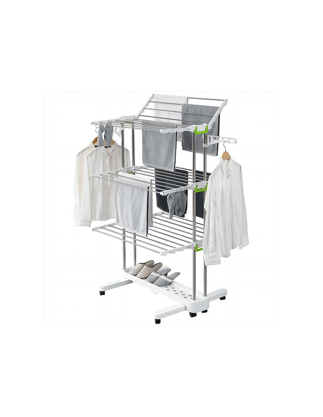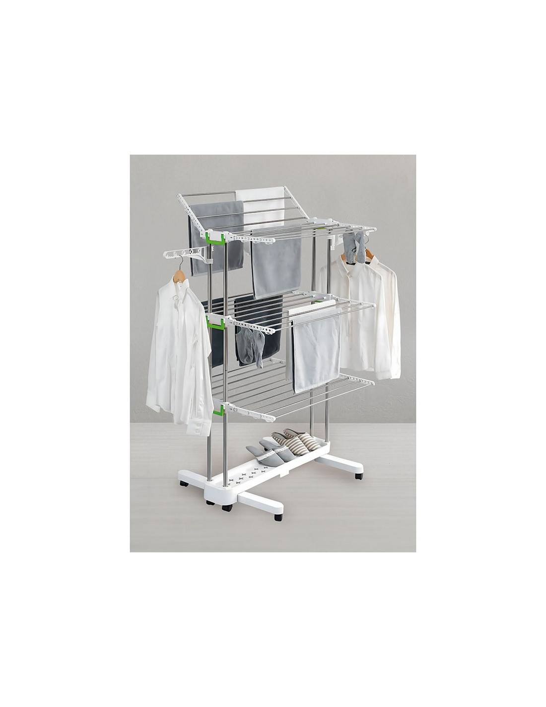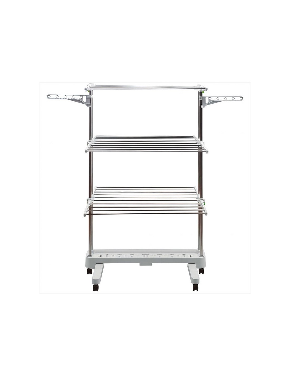 Tendedero torre plegable HABITEX Varillas acero inox con remates ABS. Ruedas de transporte con freno. Soporte para perchas. Plegable, ocupa poco espacio. Tendido 24 m. Medida: 148x76xh.144 cm.