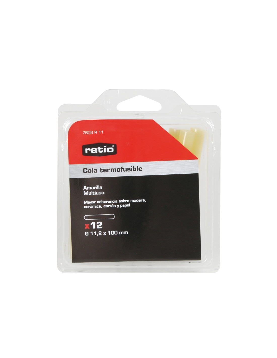Cola termofusible RATIO. Multiuso. Para mayor adherencia sobre madera, cerámica, cartón y papel. Color amarillo. ø 11,2x100 mm. 12 barras.