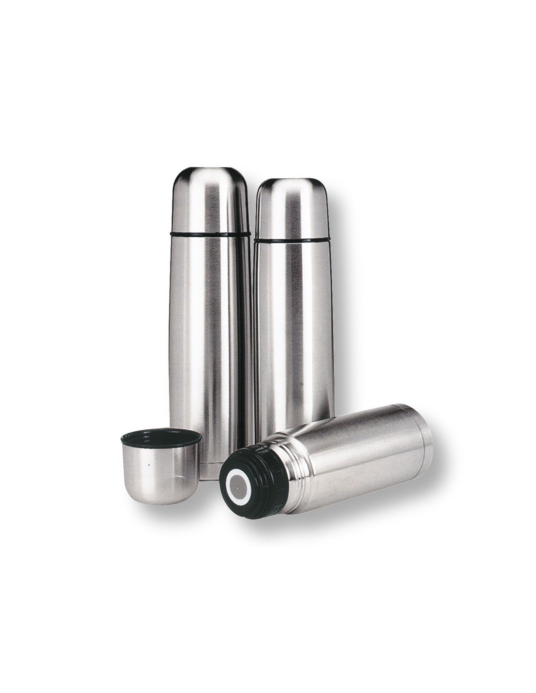 Termo. Acero inoxidable alimentario. Doble pared, cámara de vacío. Tapón con pulsador dosificador. Irrompible. 1 litro.