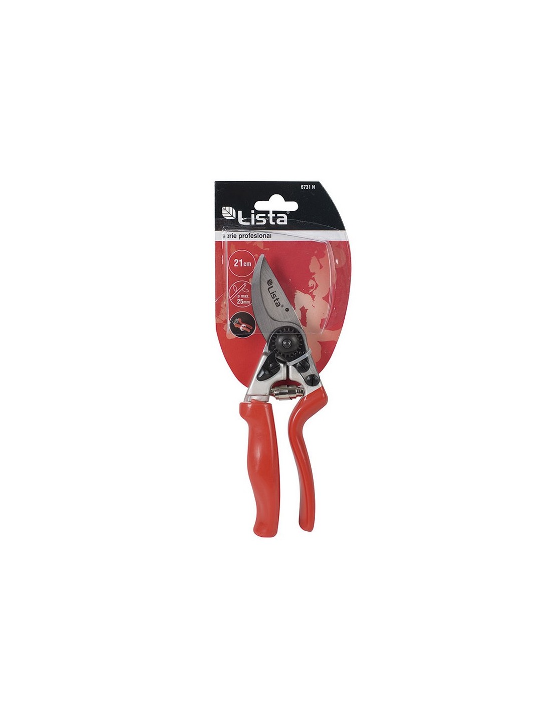 Tijera poda profesional LISTA 6731 Mango giratorio. Mangos de aluminio forjados. Corte deslizante (Bypass). Acero estampado. Ajuste con lengüeta. Muelle gusano. ø corte máx. 25 mm.