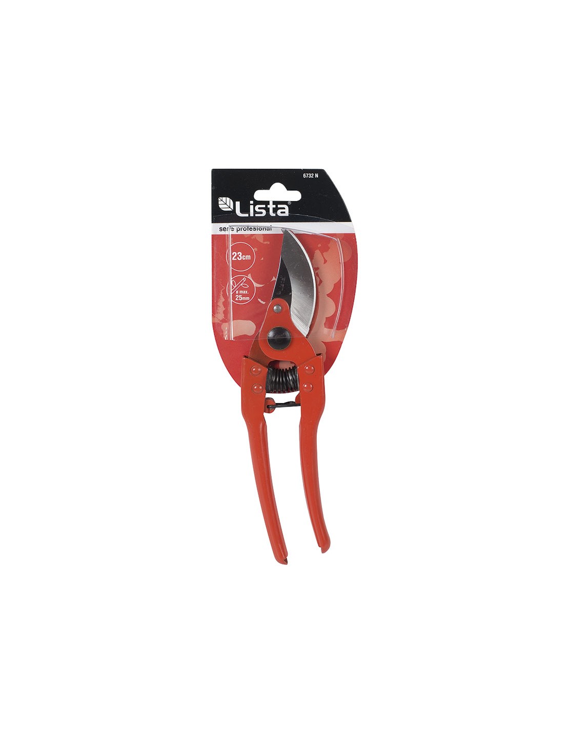 Tijera de poda LISTA seria Profesional. Corte deslizante (Bypass). Acero cromo-vanadio. Sufridera forjada. Hoja rectificada. Mangos de acero reforzado. Muelle espiral con tope de goma. Ajustada a mano. ø corte máx. 25 mm.