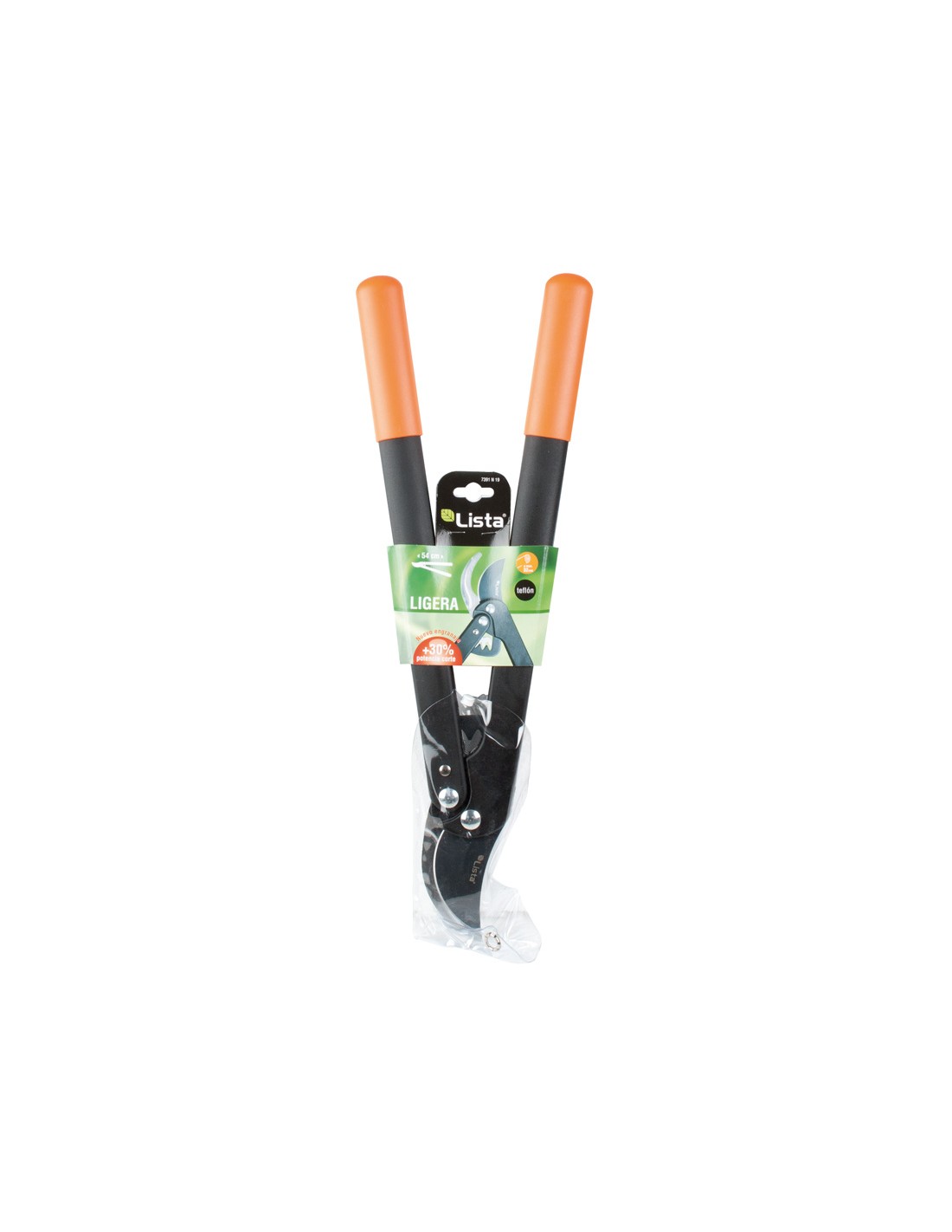 Tijera podadora ligera LISTA. Corte deslizante (Bypass). Ligera. Mangos de fibra de vidrio reforzados con nilón. Hoja antiadherente SK5 y contra hoja en SK5 acabado pulido. Empuñaduras antideslizantes. Sistema de piñones que proporciona hasta un 30% más de fuerza en el corte. ø corte máx. 32 mm.