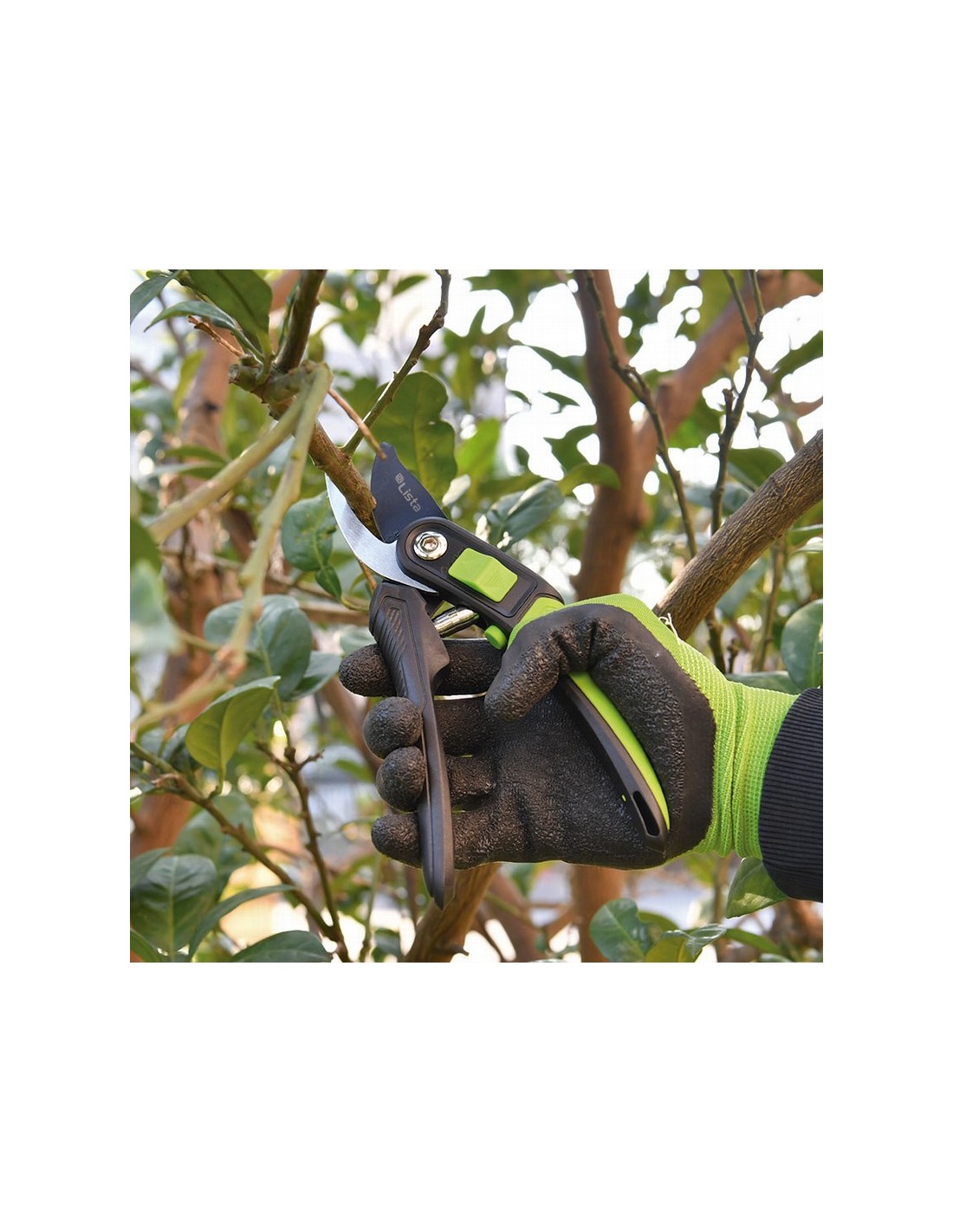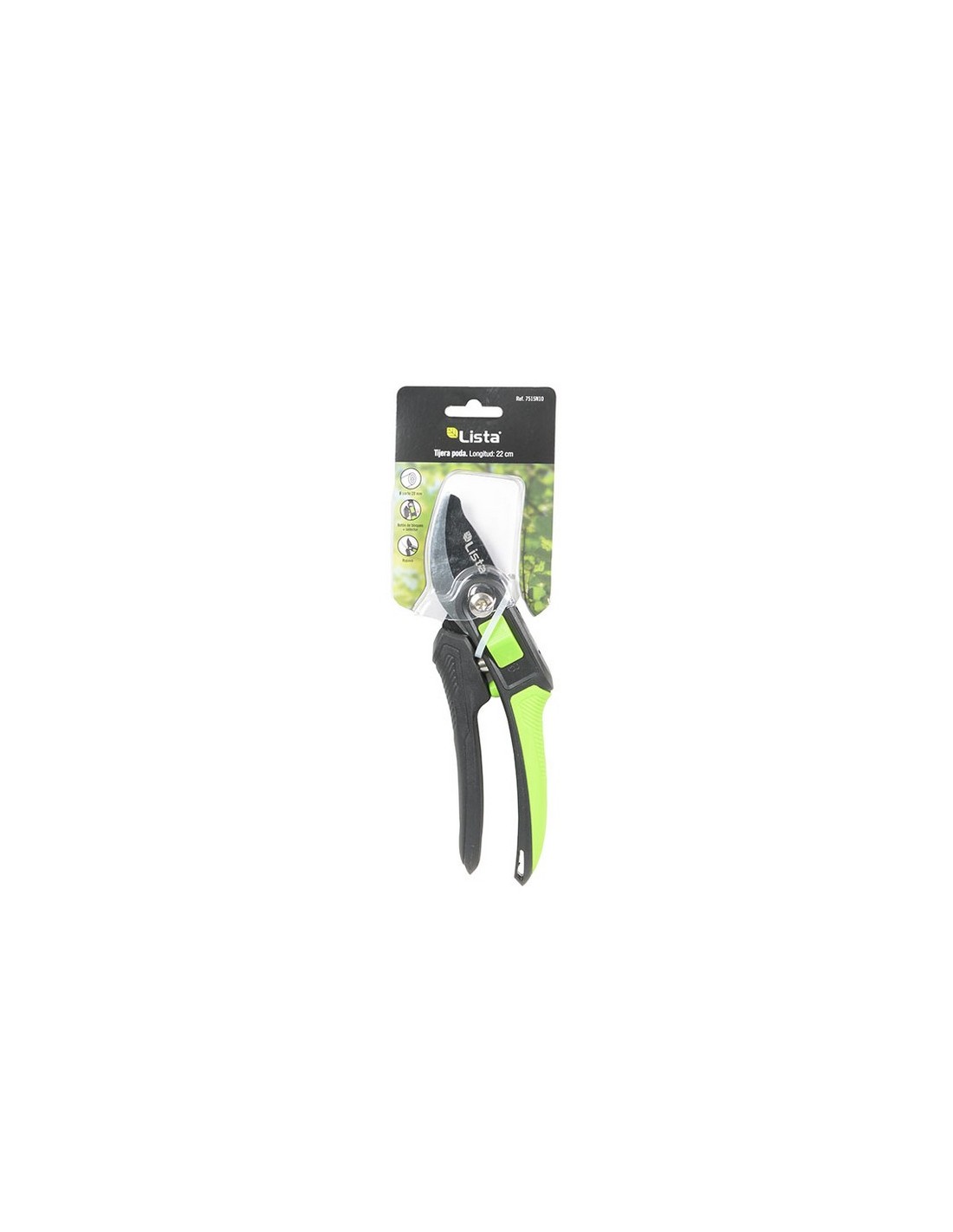 Tijera poda LISTA 7515 Corte deslizante (Bypass). Cuchillas alta calidad (SK5) con afilado de precisión y tratamiento térmico HRC54+/-2. Cuchilla recubrimiento antiadherente. Empuñadura ergonómica con recubrimiento antideslizante. Con botón ABS controla bien la apertura/bloqueo y el tamaño de apertura grande/pequeño. ø corte 20 mm. Longitud 22 cm.