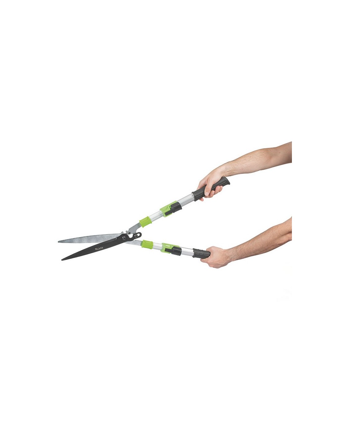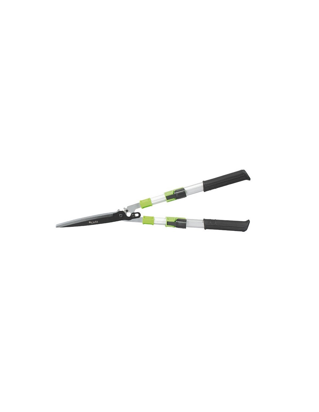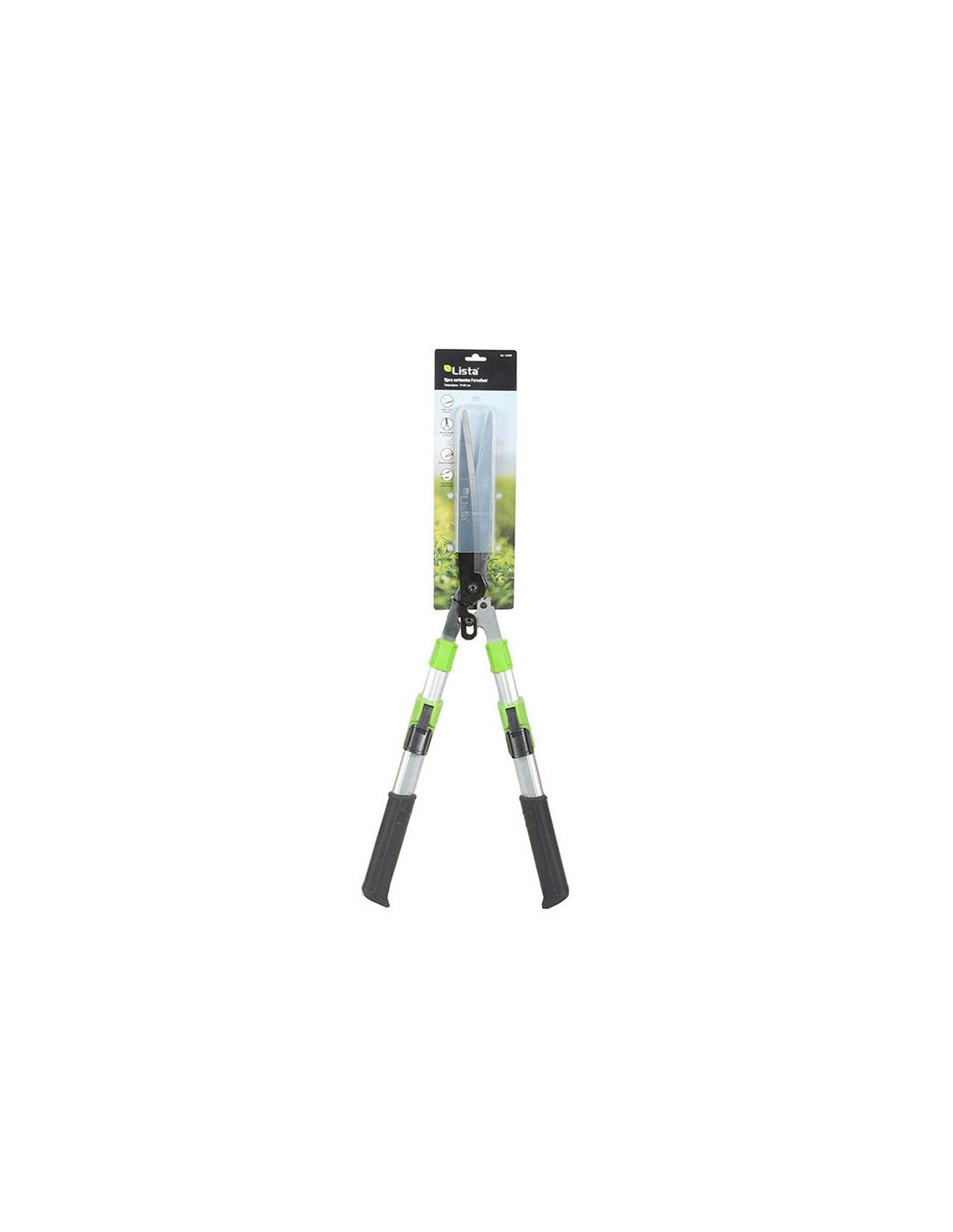 Tijera cortasetos LISTA ForceGear Diseño de acción compuesta (desmultiplicación de fuerza) ahorra más energía al cortar. Brazos tubulares telescópicos de aluminio. Hojas rectas con recubrimiento antiadherente en la hoja superior. Hoja de acero totalmente endurecida y rectificada con precisión con un filo duradero para un corte de precisión. Empuñaduras ergonómicas antideslizantes. Longitud 74-84 cm. (hoja 26 cm).