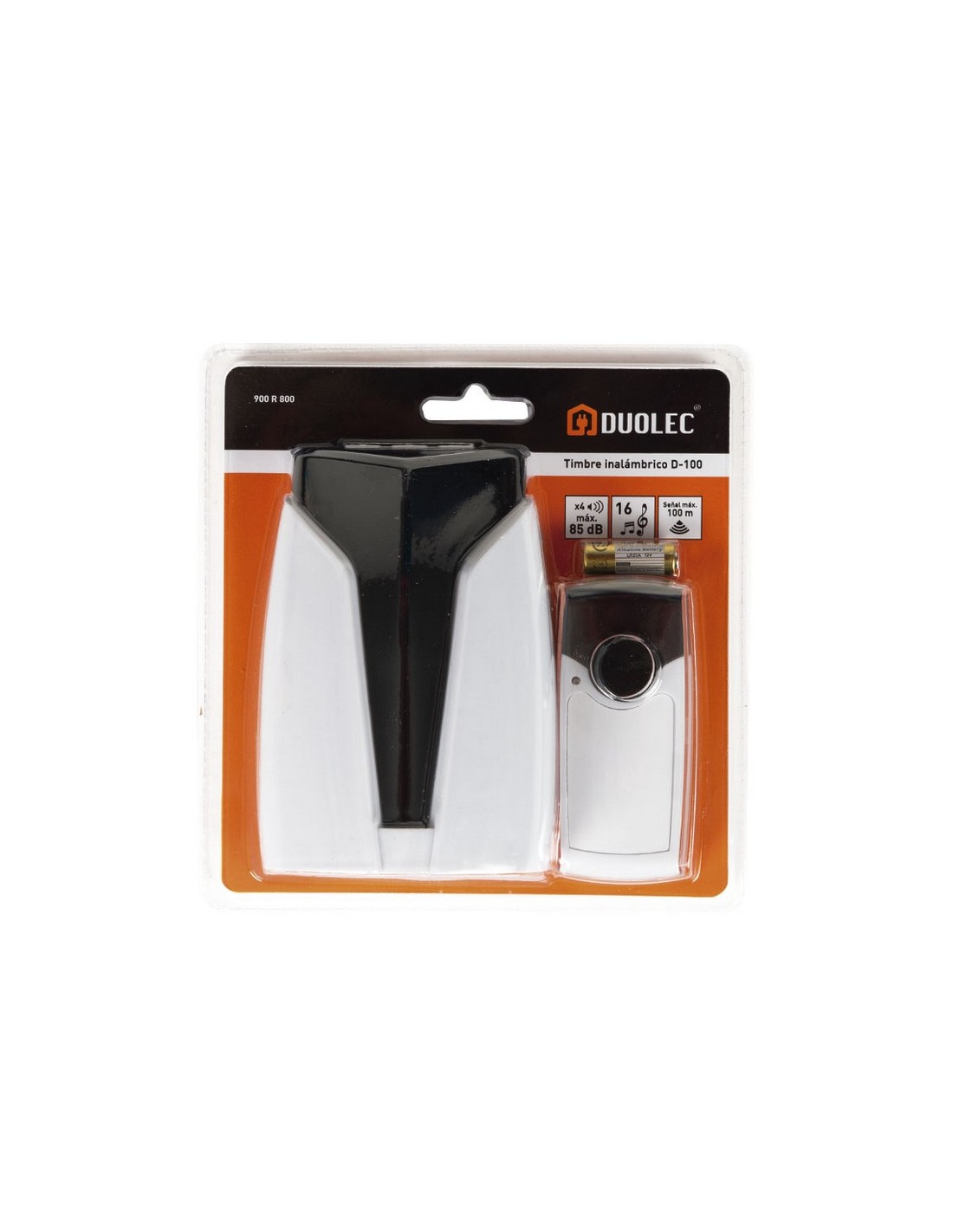 Timbre inalámbrico DUOLEC D-100. 4 ajustes de volumen. (desde silencio hasta 85 dB). 3 modos de funcionamiento: sólo melodía o sólo iluminación o melodía con iluminación. Alcance de la señal hasta 100 metros sin obstáculos. 16 melodías. Color blanco y negro. Fácil de instalar. El tr Blanco/negro.