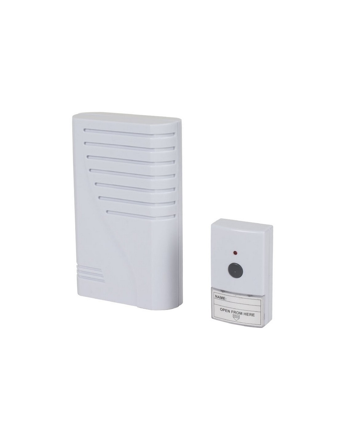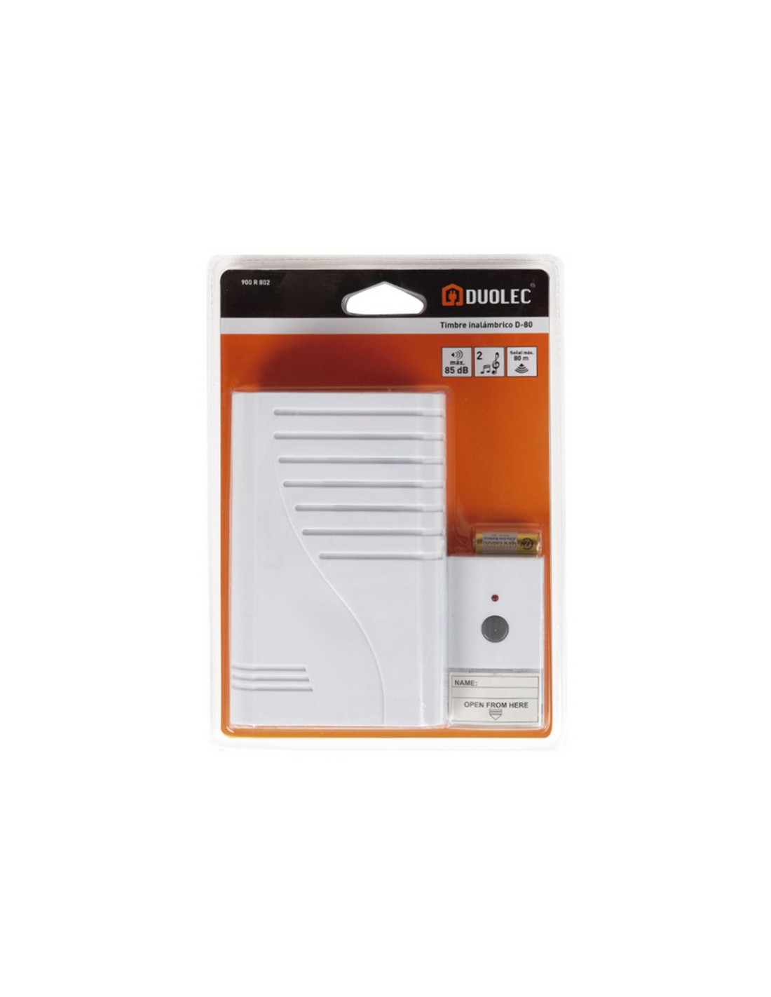 Timbre inalámbrico DUOLEC D-80. Nivel de sonido 85 dB. Alcance de la señal hasta 80 metros sin obstáculos. 2 melodías. Color blanco. Fácil de instalar. El timbre funciona con 3 pilas LR14 C (no incluidas), y el transmisor 1 pila 12V / A23 (incluida). Blanco.