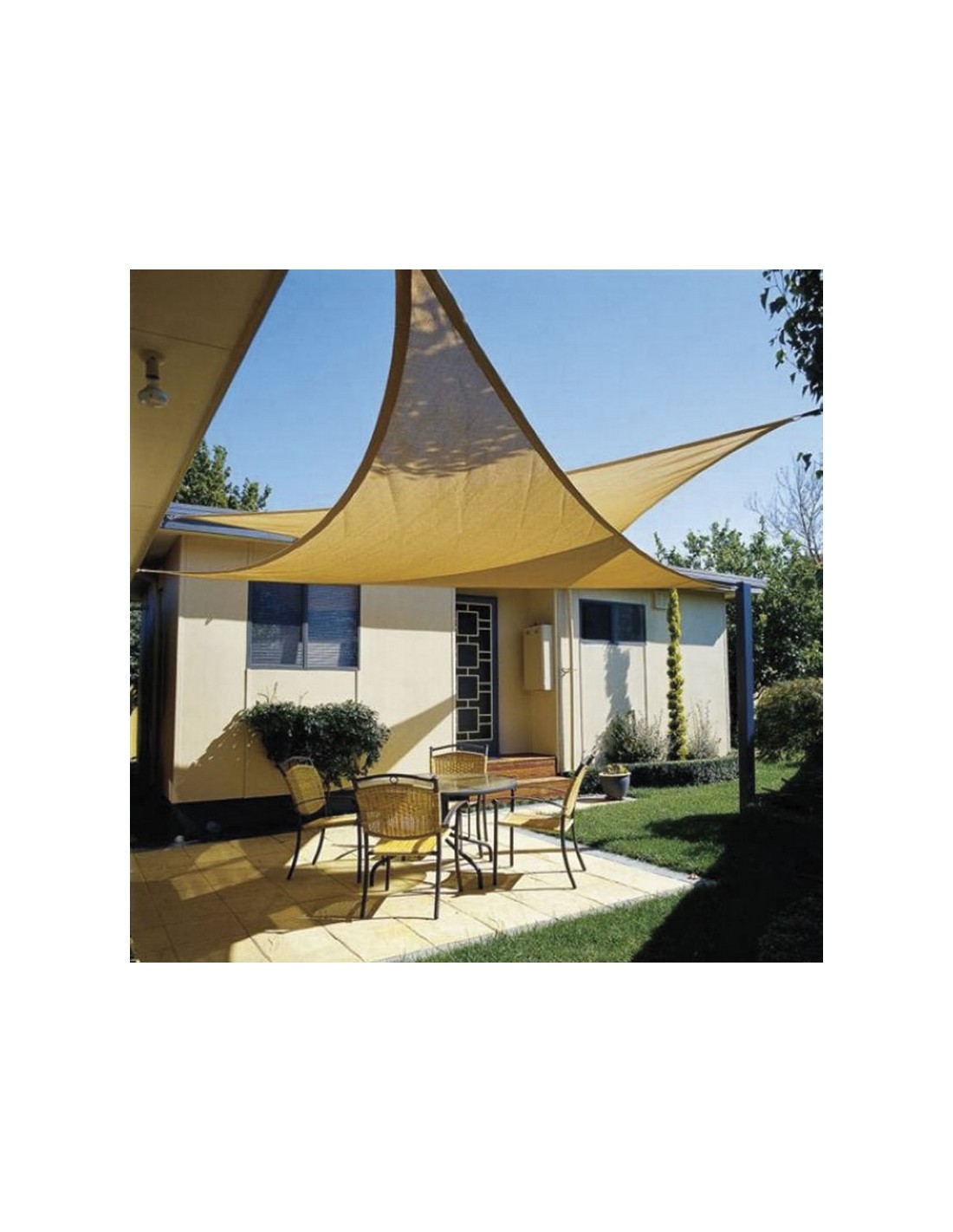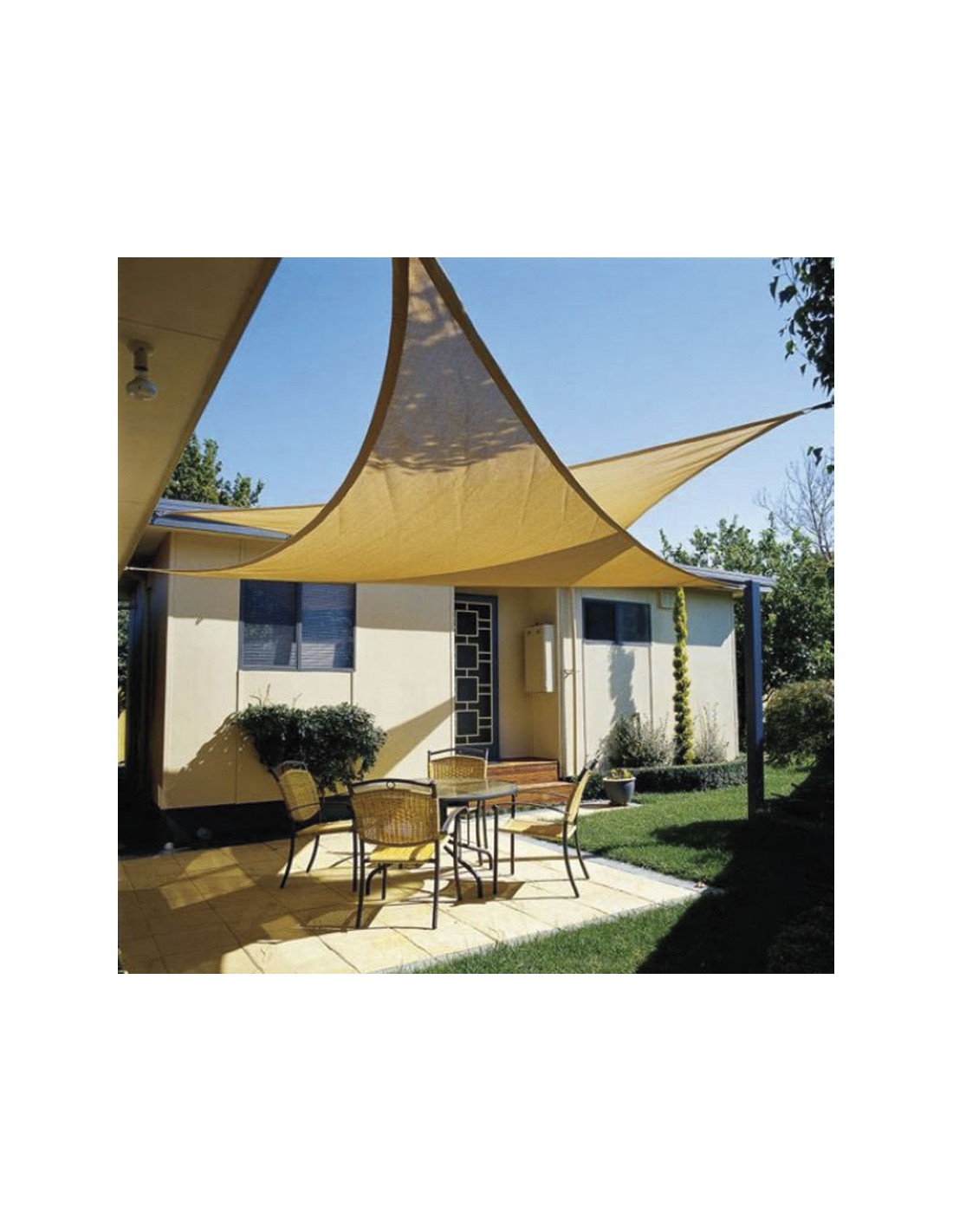 Toldo vela sombreador LISTA. HDPE 100% virgen (no reciclado) tejido. Resistente al moho y las manchas. El polietileno a diferencia de la tela o la lona no absorbe ni el agua ni la humedad. Diseño de alta resistencia con protección UV para evitar la decoloración y el deterioro. Densidad de 185 gr/m². Anillas de acero inox en las esquinas para su perfecta sujeción. Triangular. 3,6x3,6x3,6. Arena.