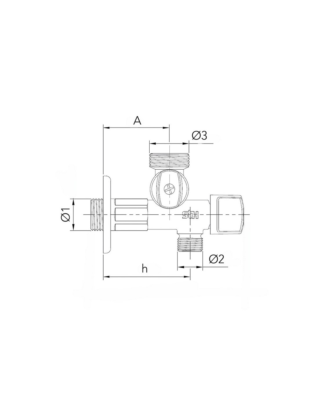 Válvula escuadra STH América Regulación y corte. Volante ABS. Cierre de membrana un cuarto de vuelta. Doble junta tórica. 1/2\" x 3/4\" x 3/8\". Sin tuerca. Doble