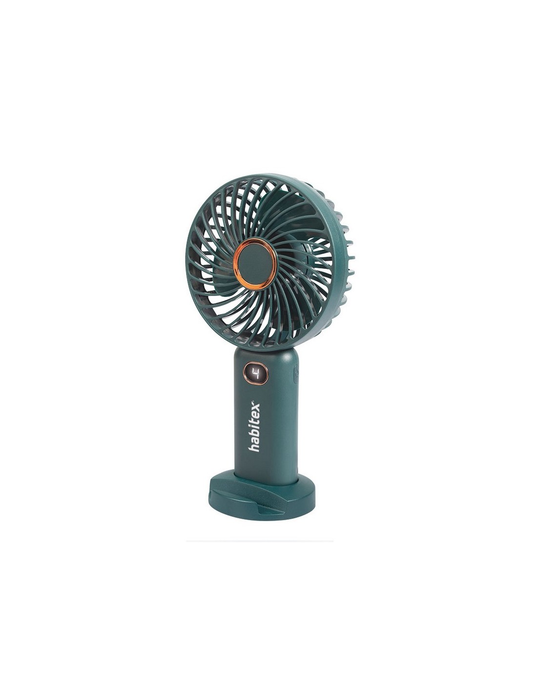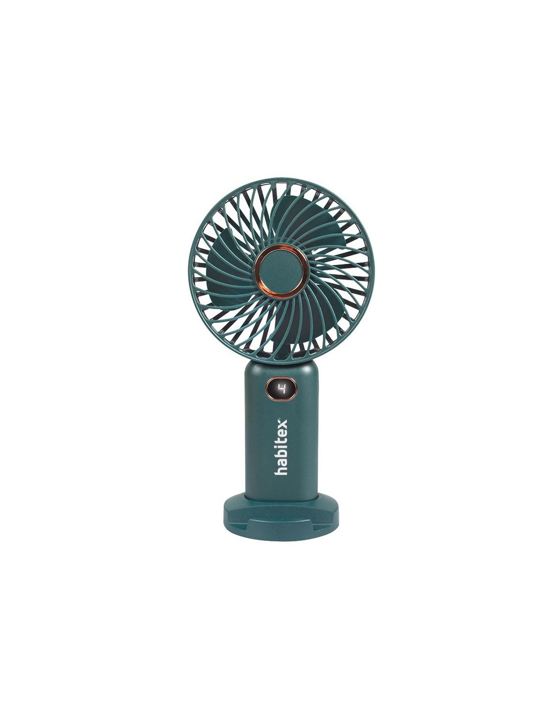 Miniventilador sobremesa USB HABITEX VMM99 4,5 W. 5 velocidades. 3 aspas. Duración máx. potencia: 1 h. Tiempo de carga: 2 h. base 6,8x4,2xh.19,8 cm. Cabezal ø 10,3 cm. USB de mano y de mesa. Plástico ABS varios colores. Pantalla digital con indicador de velocidad. Base con ranura para móvil. Color verde.
