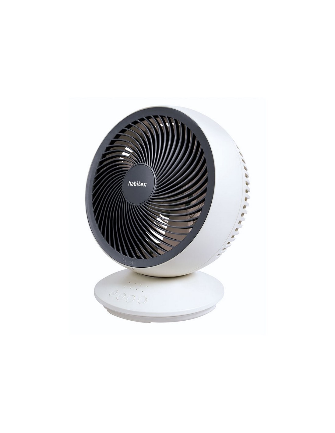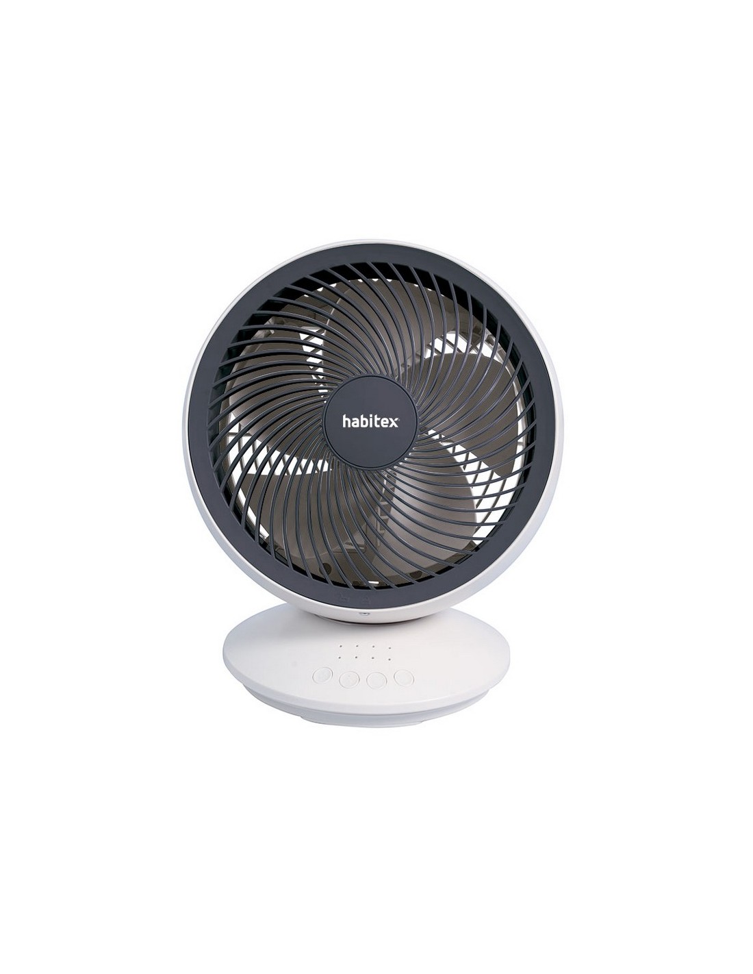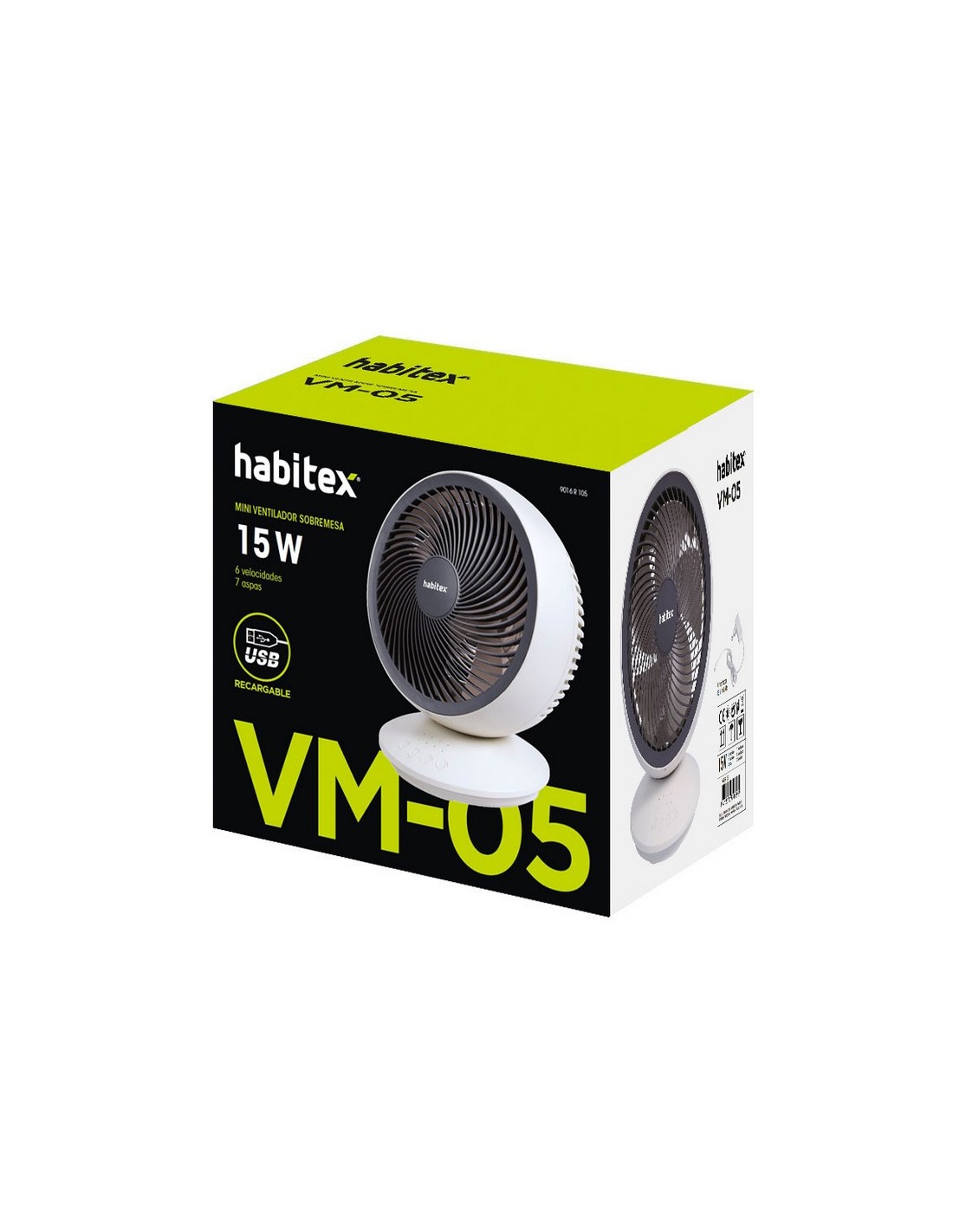 Miniventilador sobremesa batería recargable HABITEX VM-05 3 velocidades. Batería recargable USB. Hélice plástica de 5 aspas. Cabezal oscilante e inclinable. Batería litio 3.000 mAh. 10 W.