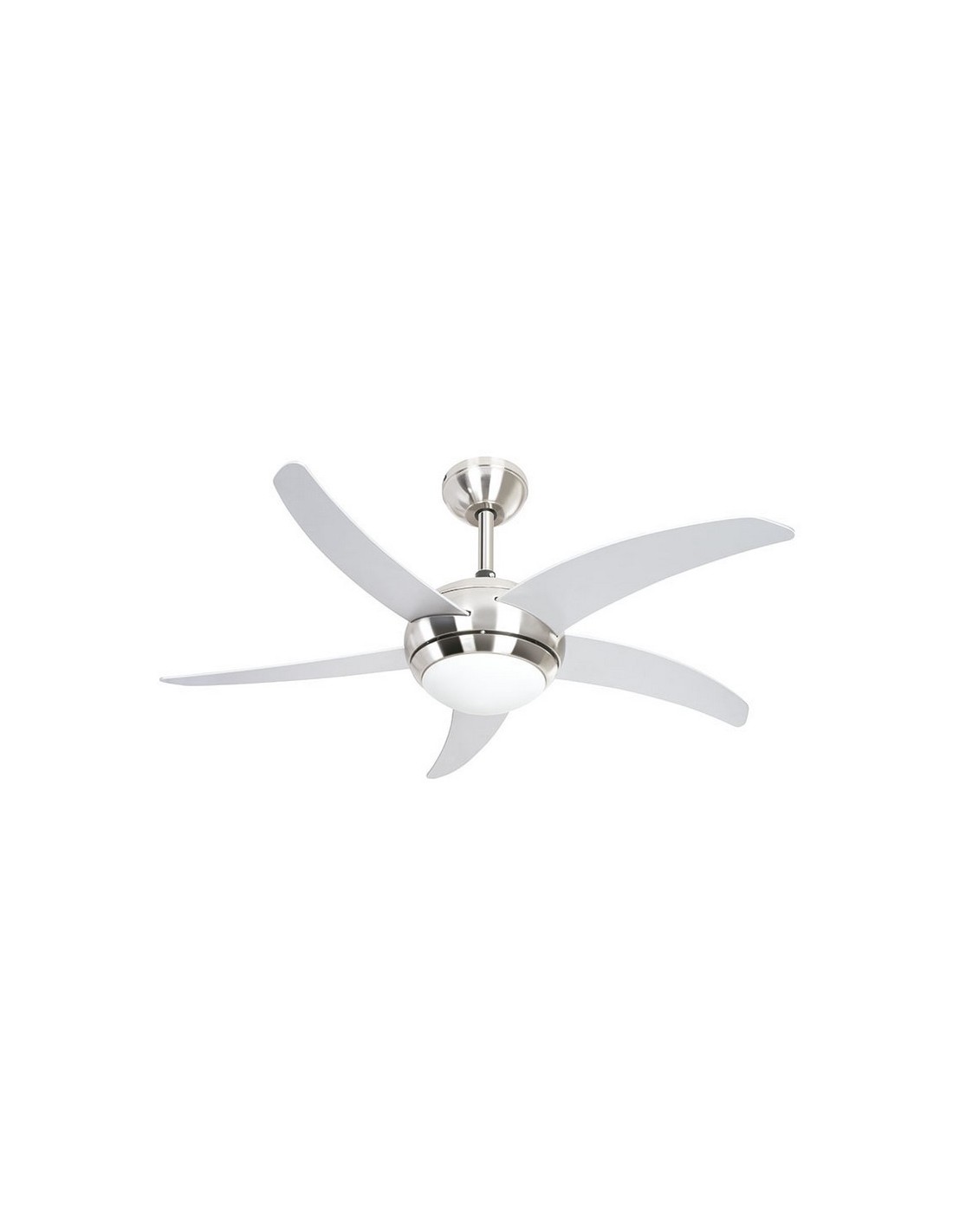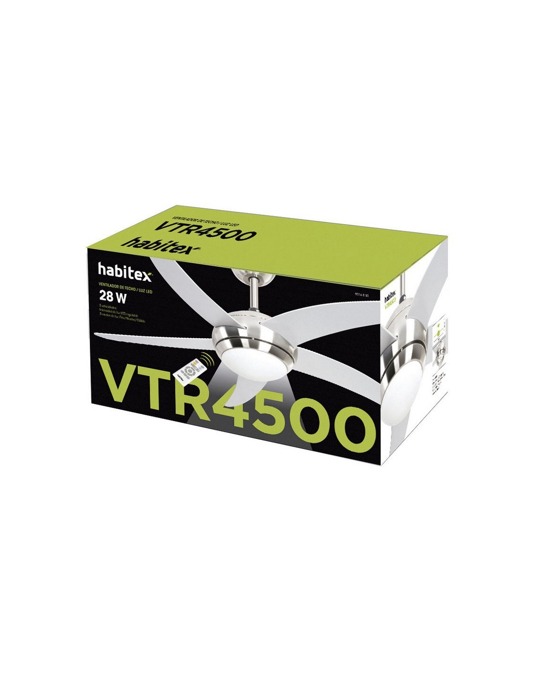 Ventilador techo con luz HABITEX VTR-4500 Motor DC muy silencioso. 5 velocidades. 5 aspas en acabado plateado. 2 funciones: ventilación y circulación de aire. Doble sentido de giro de las aspas. Luz Led con intensidad regulable 22 W en modo cálido/neutro/fría. Mando a distancia (2 pilas AAA no incluidas). 28 W.