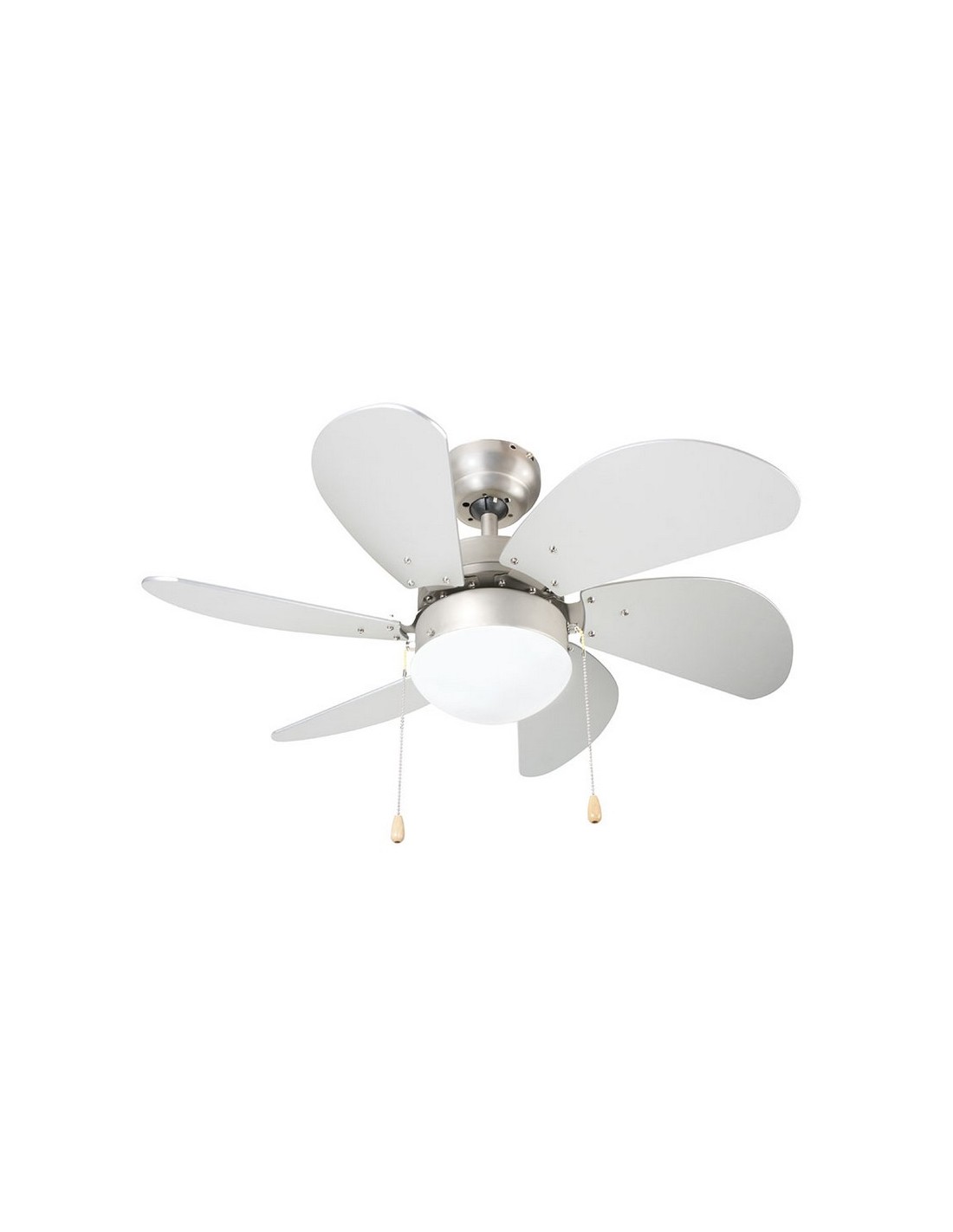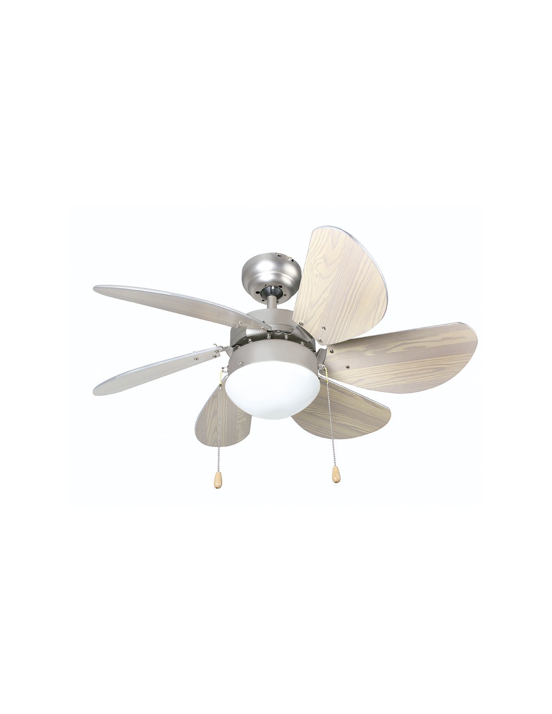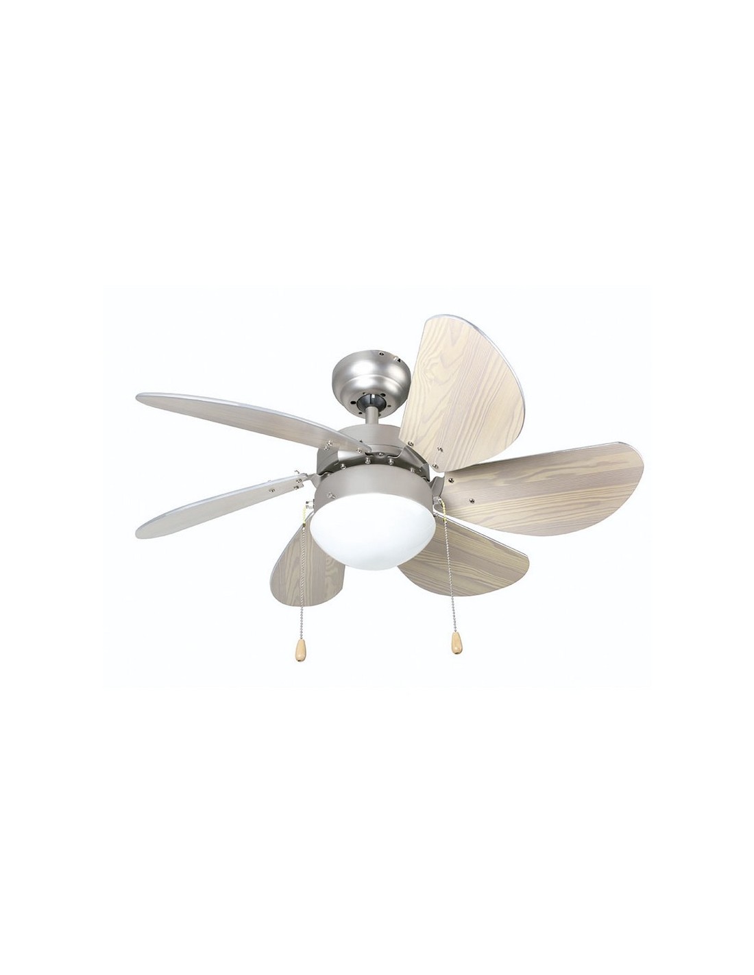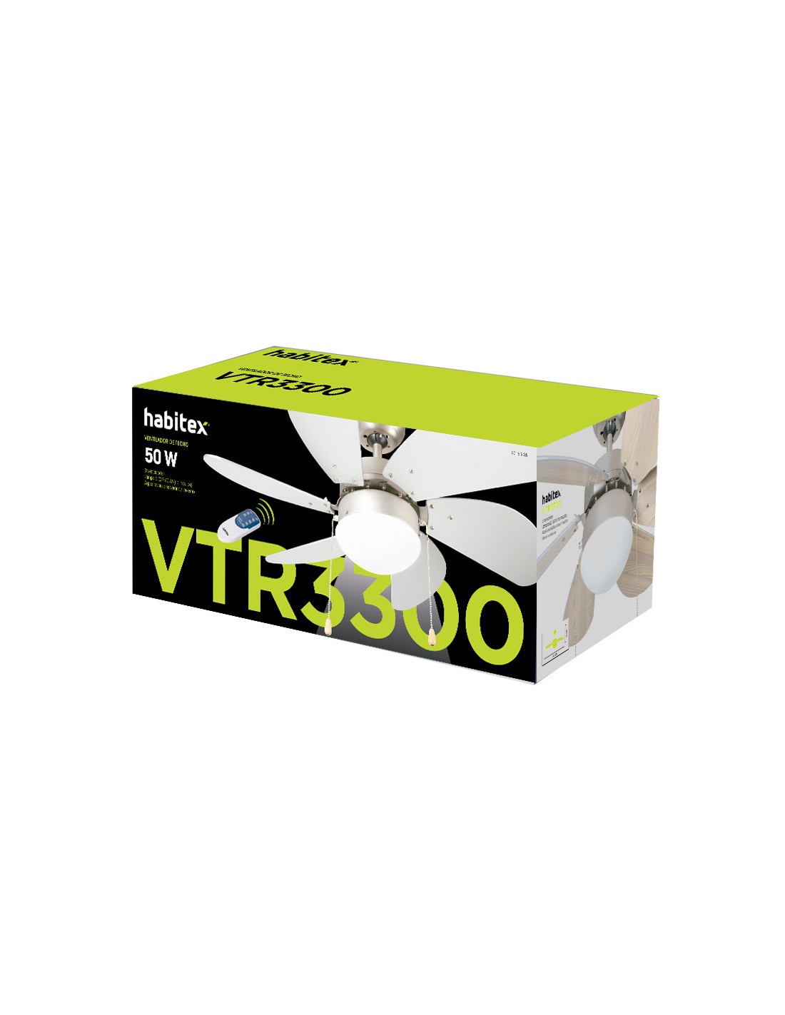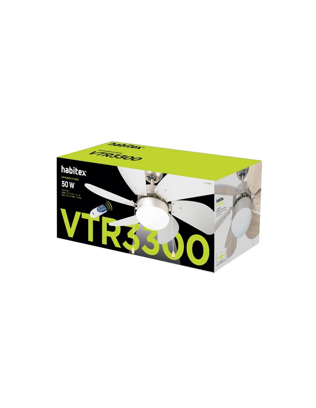 Ventilador techo con luz HABITEX VTR-3300 3 velocidades. 6 aspas reversibles en acabado cromo/haya. 2 funciones: ventilación y circulación de aire. Doble sentido de giro de las aspas. Lámpara E-27 60 W (no incluida). Mando a distancia (2 pilas AAA no incluidas). 50 W.