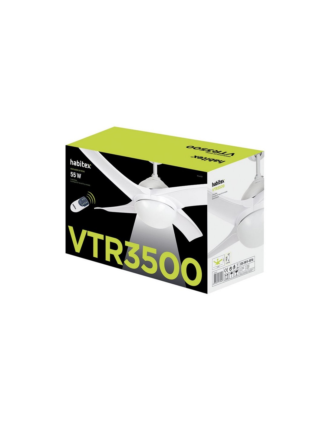 Ventilador techo con luz HABITEX VTR-3500 Hélice de 4 aspas plásticas. (Lámpara E27 máx. 60 W. no incluida). Mando a distancia (2 pilas AAA no incluidas). Pantalla de cristal. 55 W.