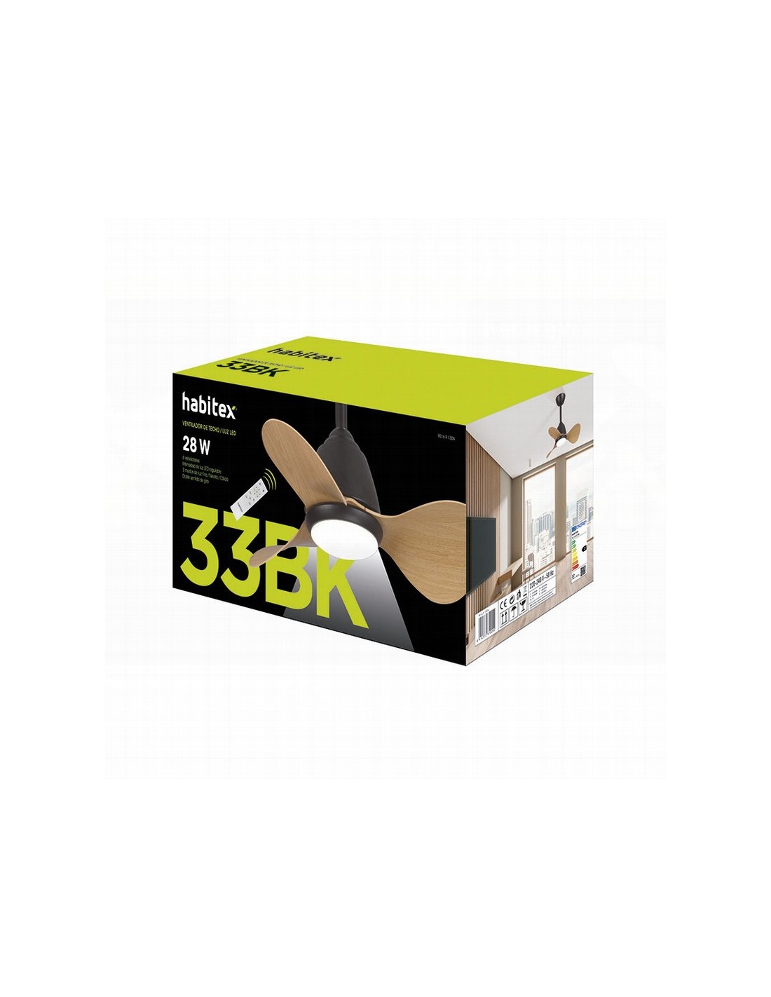Ventilador techo con luz HABITEX 33 6 velocidades. 3 aspas imitación madera. Función viento natural. Doble sentido de giro de las aspas. Luz led de 20W con intensidad regulable, modo calida, fria y neutra. Mando a distancia (2 pilas AAA no incluídas). Color Negro.