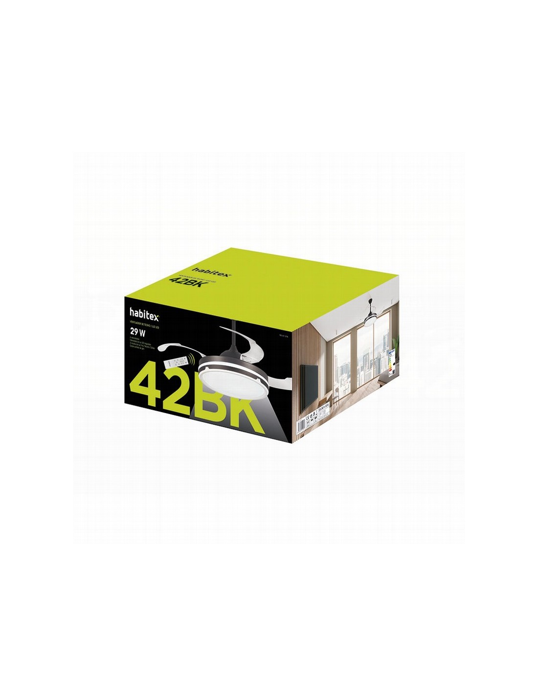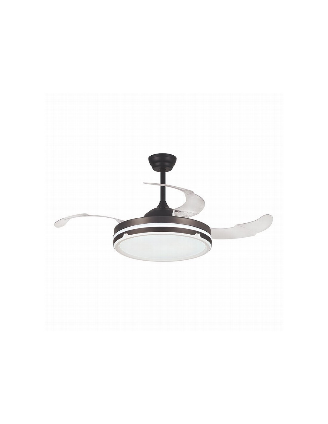 Ventilador techo con luz aspas plegables HABITEX 42 6 velocidades. Estructura blanca. 3 aspas transparentes. Función viento natural. Doble sentido de giro de las aspas. Luz led de 32W con intensidad regulable, modo calida, fria y neutra. Mando a distancia (2 pilas AAA no incluídas). Color Negro.