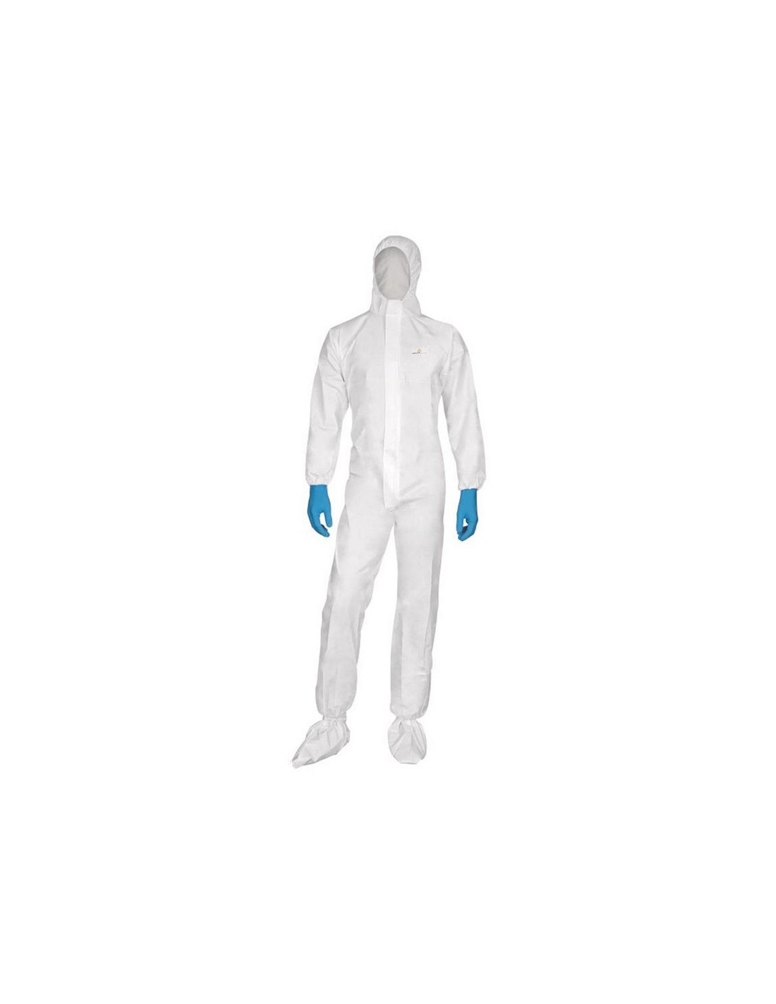 Buzo desechable antiestático DELTA PLUS DT115 Con capucha elástica, no tejido microporoso laminado 60 gr/m². Cierre por cremallera bajo solapa. Elástico de ajuste en cabeza, cintura, puños y tobillos. Riesgo químico 5 y 6. Protección biológica. EN13688:2013, EN 13982-1:2004+A1:2010, EN13034:2005 Talla XL.