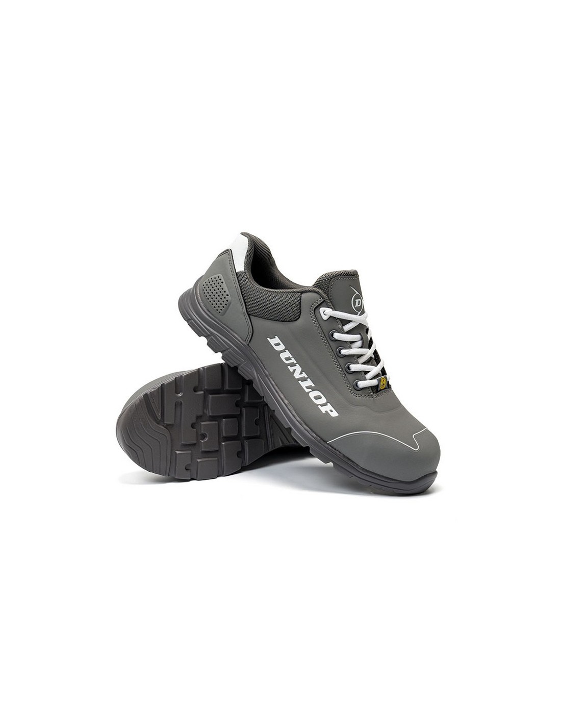 Zapatilla seguridad Dunlop S3 Matt Grey Norma EN ISO 20345:2022. Puntera fibra de vidrio, no metálica y ligera. Plantilla textil anti perforación, ligera, flexible y antimagnética. Tallas 39 a 46